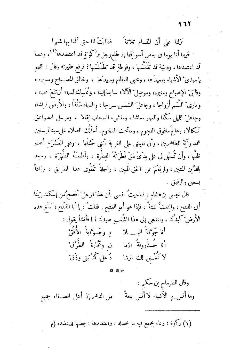 فبينا أنا يوما فى بعض أسواقها إذ طلع رجل بركوة قد اعتضدها «1» ، وعصا قد اعتمدها، ودنيّة قد تقلّسها، وفوطة قد تطيلسها؛ فرفع عقيرته وقال: اللهم يا مبدئ الأشياء ومعيدها، ومحيى العظام ومبيدها، وخالق المصباح ومديره، وفالق الإصباح ومنيره، وموصل الآلاء سابغة إلينا، وممسك السماء أن تقع علينا، وبارئ النّسم أزواجا، وجاعل الشمس سراجا، والسماء سقفا، والأرض فراشا، وجاعل الليل سكنا والنهار معاشا، ومنشىء السحاب ثقالا، ومرسل الصواعق نكالا، وعالم ما فوق النجوم، وما تحت التخوم. أسألك الصلاة على سيد المرسلين محمد وآله الطاهرين، وأن تعيننى على الغربة أثنى حبلها، وعلى العسرة أعدو ظلّها، وأن تسهّل لى على يدى من فطرته الفطرة، وأطلعته الطّهرة، وسعد بالدّين المتين، ولم يعم عن الحق المبين، راحلة تطوى هذا الطريق، وزادا يسعنى والرفيق.
