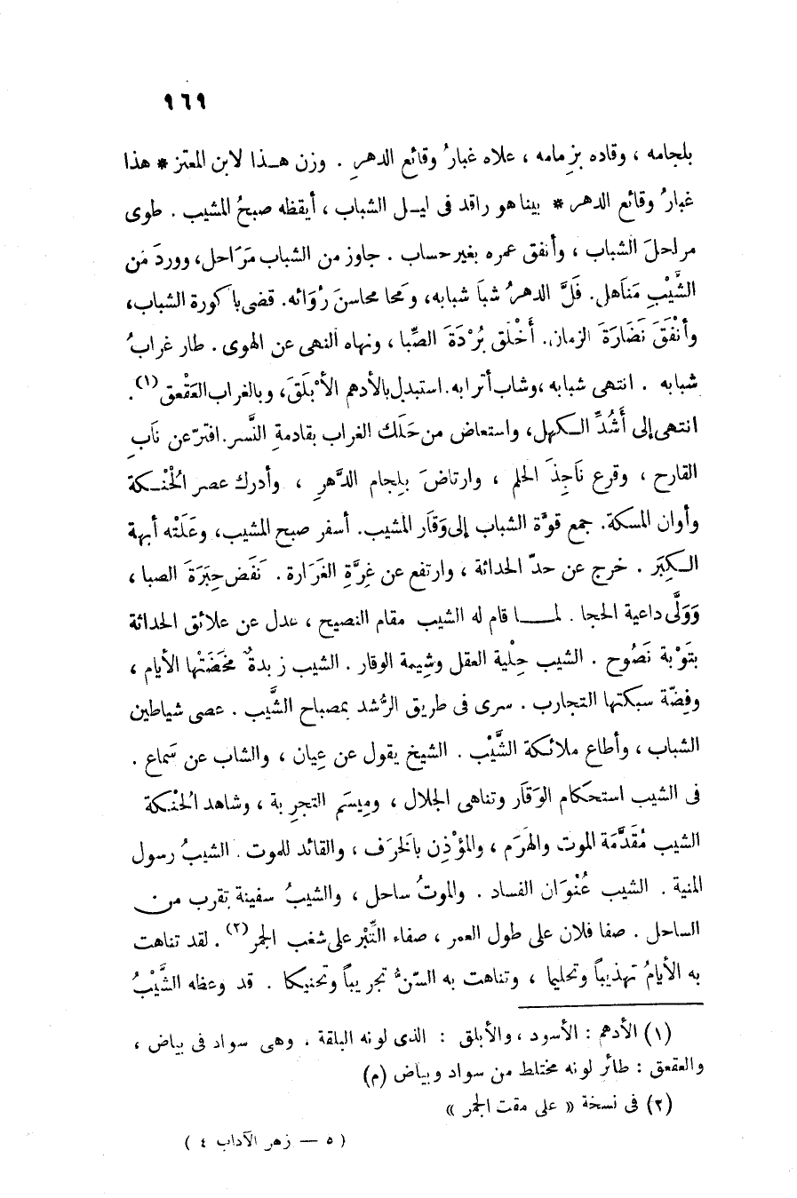 بينا هو راقد فى ليل الشباب، أيقظه صبح المشيب. طوى مراحل الشباب، وأنفق عمره بغير حساب. جاوز من الشباب مراحل، وورد من الشّيب مناهل. فلّ الدهر شبا شبابه، ومحا محاسن روائه. قضى باكورة الشباب، وأنفق نضارة الزمان. أخلق بردة الصّبا، ونهاه النهى عن الهوى. طار غراب شبابه. انتهى شبابه، وشاب أترابه. استبدل بالأدهم الأبلق، وبالغراب العقعق «1» .