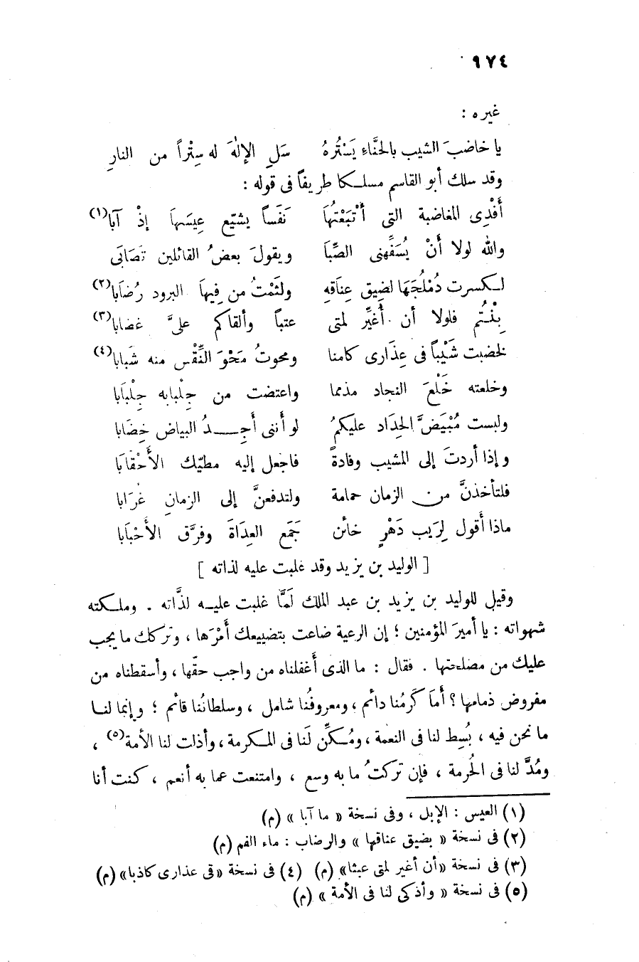 وقيل للوليد بن يزيد بن عبد الملك لمّا غلبت عليه لذّاته. وملكته شهواته: يا أمير المؤمنين؛ إن الرعية ضاعت بتضييعك أمرها، وتركك ما يجب عليك من مصلحتها. فقال: ما الذى أغفلناه من واجب حقّها، وأسقطناه من مفروض ذمامها؟ أما كرمنا دائم، ومعروفنا شامل، وسلطاننا قائم؛ وإنما لنا ما نحن فيه، بسط لنا فى النعمة، ومكّن لنا فى المكرمة، وأذلت لنا الأمة «5» ، ومدّ لنا فى الحرمة، فإن تركت ما به وسع، وامتنعت عما به أنعم، كنت أنا