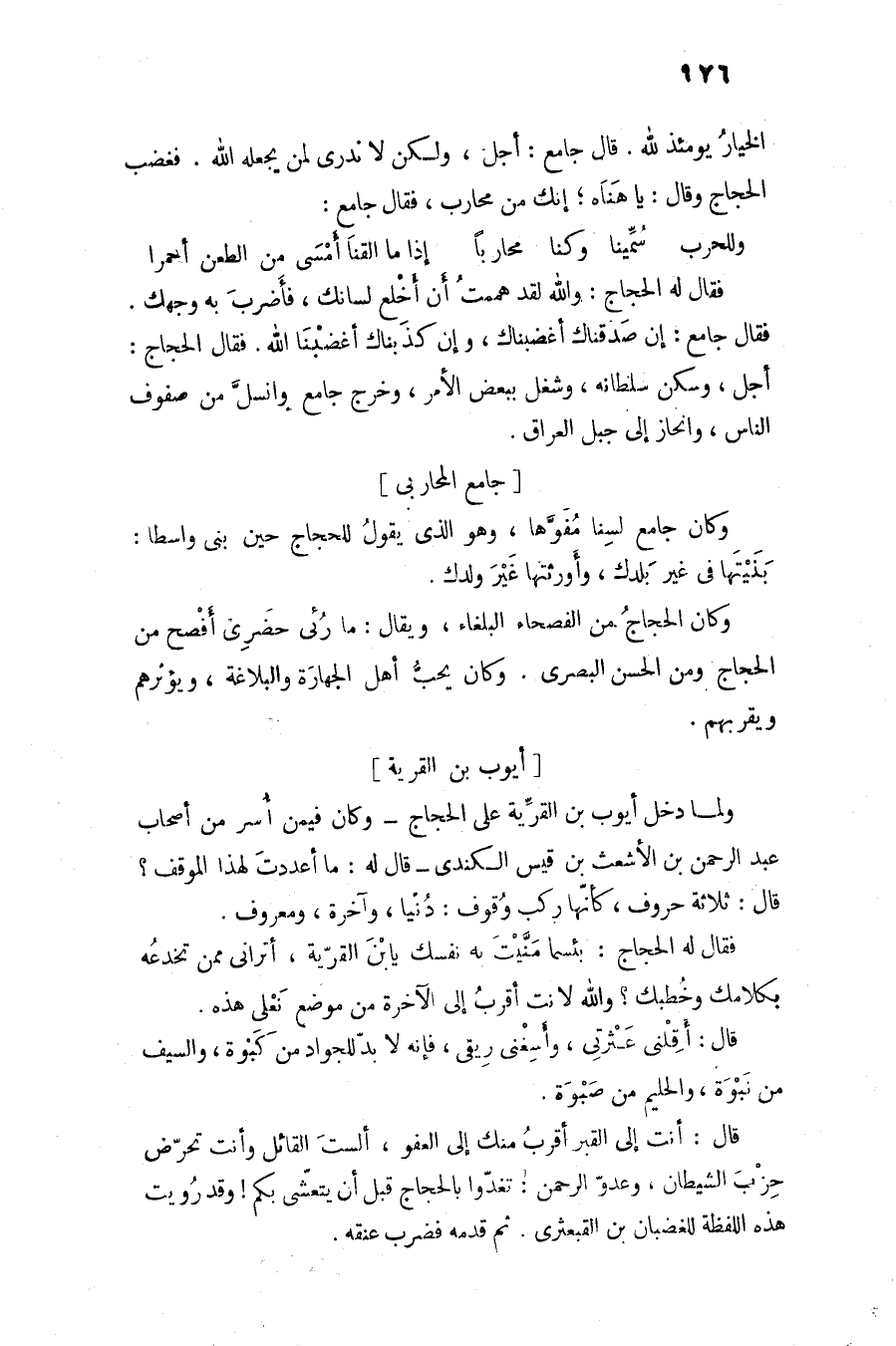 الخيار يومئذ لله. قال جامع: أجل، ولكن لا ندرى لمن يجعله الله. فغضب الحجاج وقال: يا هناه؛ إنك من محارب، فقال جامع:
