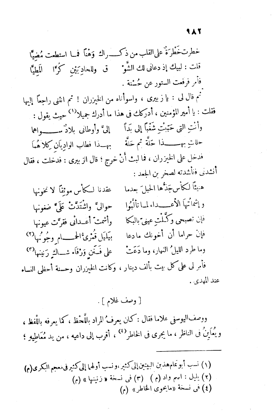 ثم قال لى: يا زبيرى، واسوأتاه من الخيزران! ثم انثنى راجعا إليها فقلت: يا أمير المؤمنين، أدركك فى هذا ما أدرك جميلا «1» حيث يقول:
