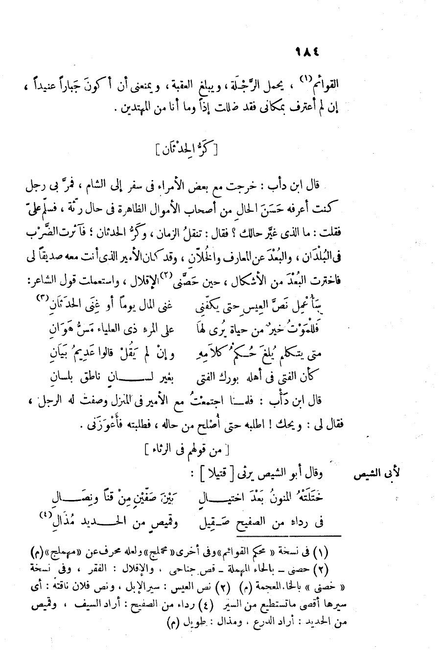 قال ابن دأب: خرجت مع بعض الأمراء فى سفر إلى الشام، فمرّ بى رجل كنت أعرفه حسن الحال من أصحاب الأموال الظاهرة فى حال رثّة، فسلّم علىّ فقلت: ما الذى غيّر حالك؟ فقال: تنقل الزمان، وكرّ الحدثان؛ فآثرت الضّرب فى البلدان، والبعد عن المعارف والخلّان، وقد كان الأمير الذى أنت معه صديقا لى فاخترت البعد من الأشكال، حين حصّنى «2» الإقلال، واستعملت قول الشاعر: