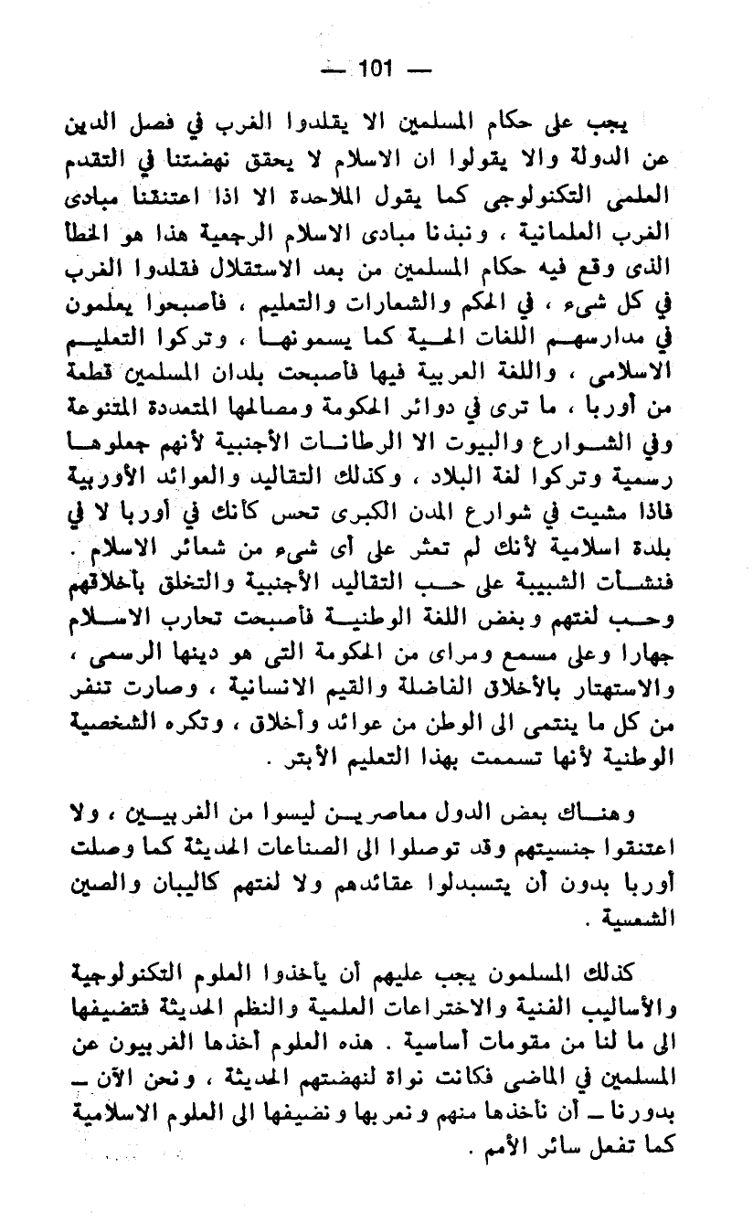 يجب على حكام المسلمين الا يقلدوا الغرب في فصل الدين عن الدولة والا يقولوا أن الاسلام لا يحقق نهضتنا في التقدم العلمي التكنولوجي كما يقول الملاحدة الا اذا اعتنقنا مبادئ الغرب العلمانية، ونبذنا مبادئ الاسلام الرجعية هذا هـ الخطأ الذي وقع فيه حكام المسلمين من بعد الاستقلال فقلدوا الغرب في كل شيء، في الحكم والشعارات والتعليم، فأصبحوا يعلمون في مدارسهم اللغات الحية كما يسمونها، وتركوا التعليم الاسلامي، واللغة العربية فيها فأصبحت بلدان المسلمين قطعة من أوربا، ما ترى في دوائر الحكومة ومصالحها المتعددة المتنوعة في الشوارع والبيوت الا الرطانات الاجنبية لأنهم جعلوها رسمية وتركوا لغة البلاد، وكذلك التقاليد والعوائد الأوربية فإذا مشيت في شوارع المدن الكبرى تحس كأنك في أوربا لا في بلدة اسلامية لأنك لم تعثر على أي شيء من شعائر الإسلام.