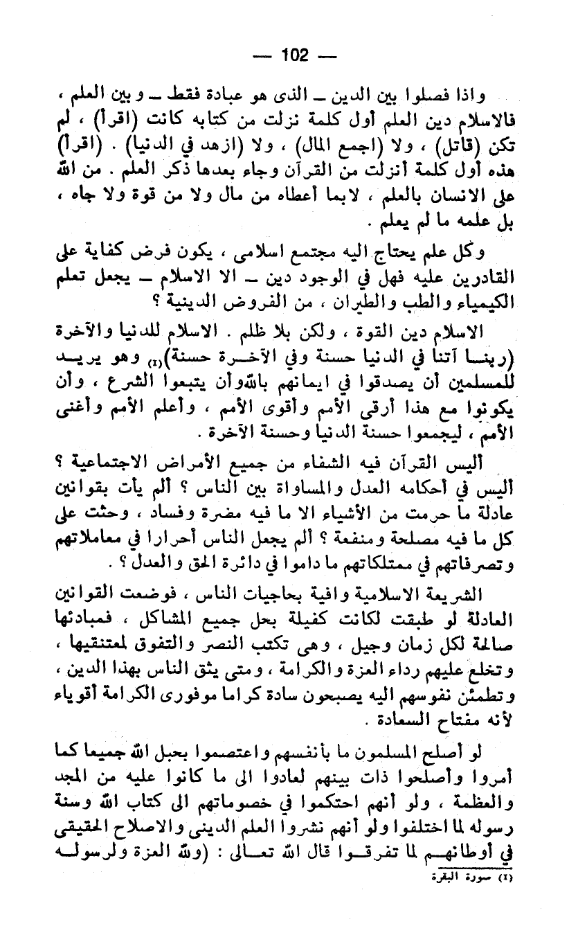 الاسلام دين القوة، ولكن بلا ظلم. الاسلام للدنيا والآخرة) ربنا آتنا في الدنيا حسنة وفي الآخرة حسنة) (¬1) وهو يريد للمسلمين أن يصدقوا في إيمانهم بالله وأن يتبعوا الشرع، وأن يكونوا مع هذا أرقى الامم وأقوى الأمم، وأعلم الأمم وأغنى الامم، ليجمعوا حسنة الدنيا وحسنة الآخرة.