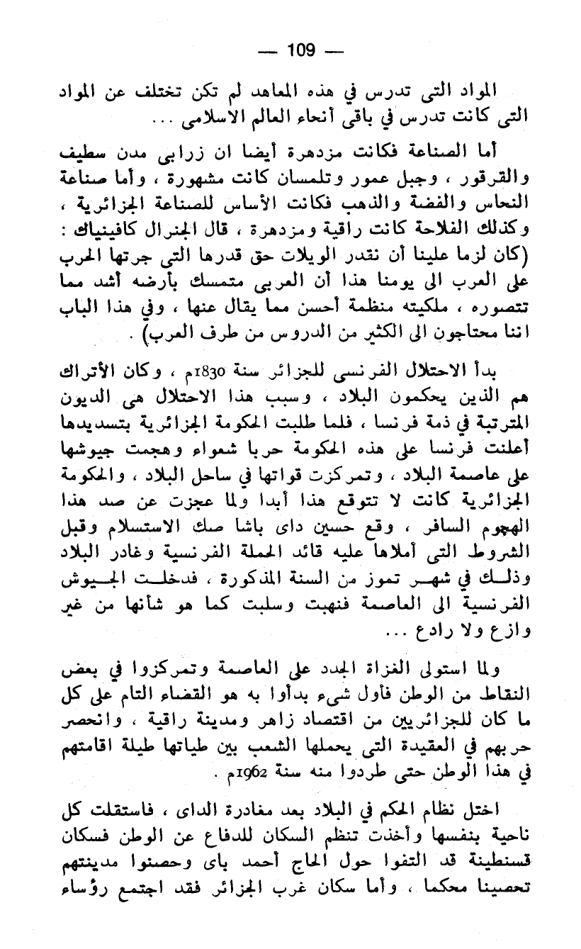 ولما استولى الغزاة الجدد على العاصمة وتمركزوا في بعض النقاط من الوطن فأول شيء بدأوا به هو القضاء التام على كل ما كان للجزائريين من اقتصاد زاهر ومدينة راقية، وانحصر حربهم في العقيدة التي يحملها الشعب بين طياتها طيلة إقامتهم في هذا الوطن حتى طردوا منه سنة 1962 م.