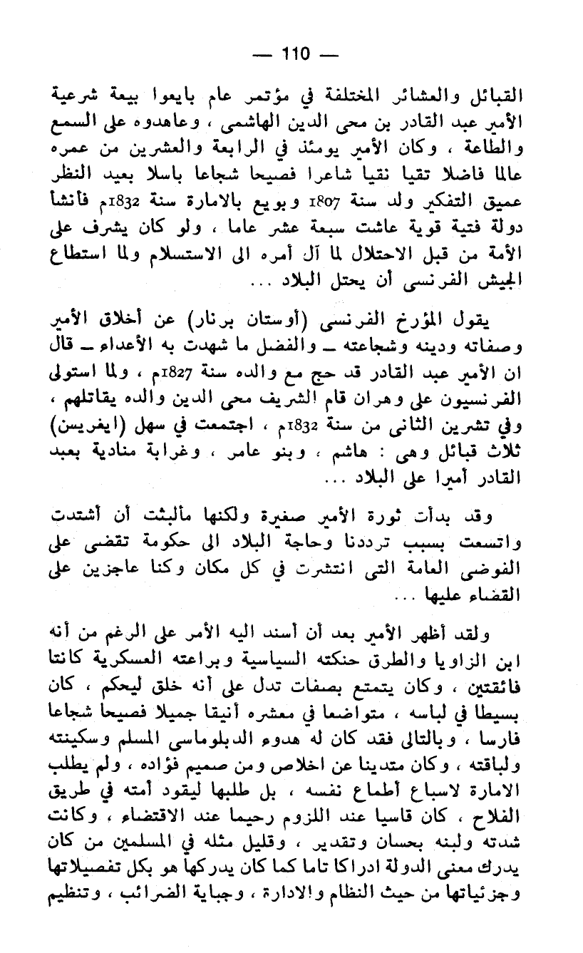 القبائل والعشائر المختلفة في مؤتمر عام بايعوا بيعة شرعية الأمير عبد القادر بن محي الدين الهاشمي، وعاهدوه على السمع والطاعة، وكان الأمير يومئذ في الرابعة والعشرين من عمره عالما فاضلا تقيا نقيا شاعرا فصيحا شجاعا باسلا بعيد النظر عميق التفكير ولد سنة 1807م وبويع بالإمارة سنة 1832م فأنشأ دولة فتية قوية عاشت سبعة عشر عاما، ولو كان يشرف على الأمة من قبل الاحتلال لما آل أمره الى الاستسلام ولما استطاع الجيش الفرنسي أن يحتل البلاد ...