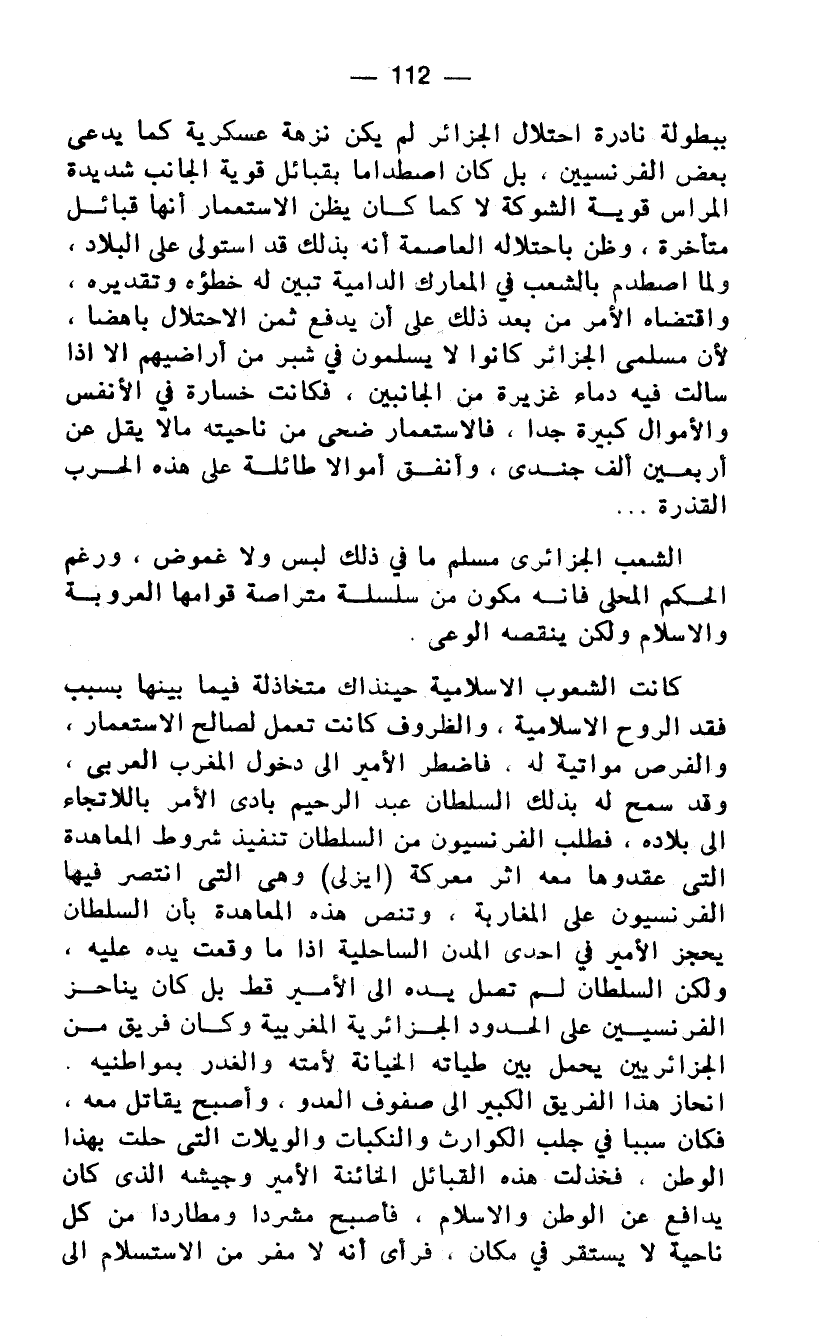 الشعب الجزائري مسلم ما في ذلك لبس ولا غموض، ورغم الحكم المحلي فإنه مكون من سلسلة متراصة قوامها العروبة والاسلام ولكن ينقصه الوعي.