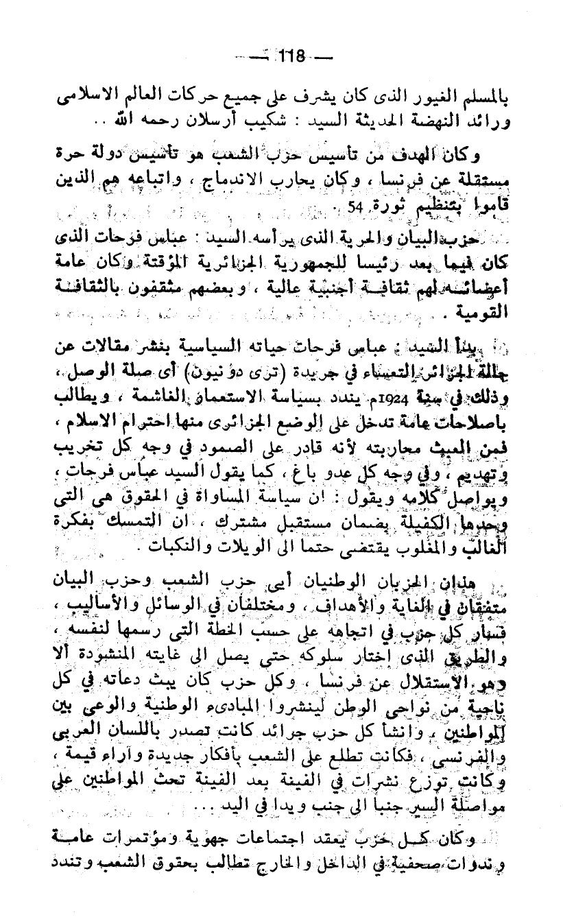 حزب البيان والحرية الذى يرأسه السيد: عباس فرحات الذى كان فيما بعد رئيسا للجمهورية الجزائرية المؤقتة وكان عامة أعضائه لهم ثقافة أجنبية عالية، وبعضهم مثقفون بالثقافة القومية.