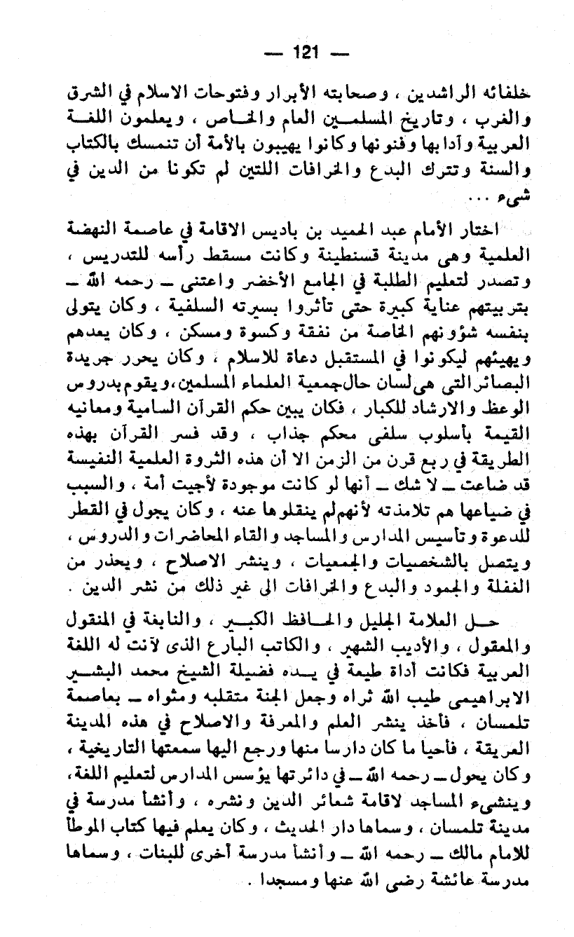 حل العلامة الجليل والحافظ الكبير، والنابغة في المنقول والمعقول، والأديب الشهير، والكاتب البارع الذى لانت له اللغة العربية فكانت أداة طيعة في يده فضيلة الشيخ محمد البشير الإبراهيمي طيب الله ثراه وجعل الجنة متقلبه ومثواه - بعاصمة تلمسان، فأخذ ينشر العلم والمعرفة والاصلاح في هذه المدينة العريقة، فأحيا ما كان دارسا منها ورجع إليها سمعتها التاريخية، وكان يجول - رحمه الله - في دائرتها يؤسس المدارس لتعليم اللغة، وينشئ المساجد لإقامة شعائر الدين ونشره. وأنشأ مدرسة في مدينة تلمسان، وسماها دار الحديث، وكان يعلم فيها كتاب الموطأ للإمام مالك - رحمه الله - وأنشأ مدرسة أخرى للبنات، وسماها مدرسة عائشة رضي الله عنها ومسجدا.