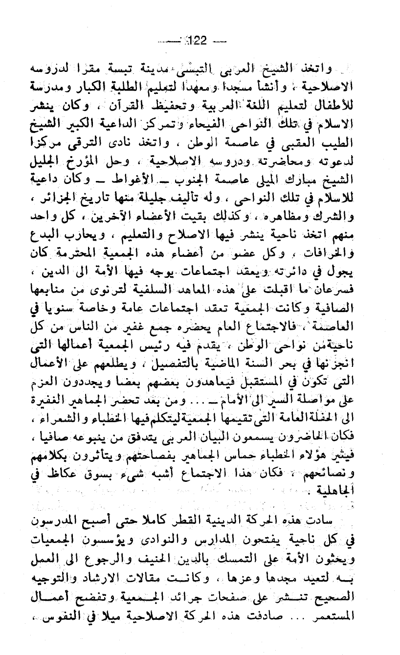 واتخذ الشيخ العربي التبسي مدينة تبسة مقرا لدروسه الاصلاحية، وأنشأ مسجدا ومعهدا لتعليم الطلبة الكبار ومدرسة للأطفال لتعليم اللغة العربية وتحفيظ القرآن، وكان ينشر الاسلام في تلك النواحي الفيحاء وتمركز الداعية الكبير الشيخ الطيب العقبي في عاصمة الوطن، واتخذ نادى الترقي مركزا لدعوته ومحاضرته ودروسه الاصلاحية، وحل المؤرخ الجليل الشيخ مبارك الميلي عاصمة الجنوب - الأغواط - وكان داعية للإسلام في تلك النواحي، وله تآليف جليلة منها تاريخ الجزائر، والشرك ومظاهره، وكذلك بقيت الأعضاء الآخرين، كل واحد منهم اتخذ ناحية ينشر فيها الاصلاح والتعليم، ويحارب البدع والخرافات، وكل عضو من أعضاء هذه الجمعية المحترمة كان يجول في دائرته ويعقد اجتماعات يوجه فيها الأمة الى الدين، فسرعان ما اقبلت على هذه المعاهد السلفية لترتوي من منابعها الصافية وكانت الجمعية تعقد اجتماعات عامة وخاصة سنويا في العاصمة، فالاجتماع العام يحضره جمع غفير من الناس من كل ناحية من نواحي الوطن، يقدم فيه رئيس الجمعية أعمالها التي أنجزتها في بحر السنة الماضية بالتفصيل، ويطلعهم على الأعمال التي تكون في المستقبل فيعاهدون بعضهم بعضا ويجددون العزم على مواصلة السير الى الأمام - ... ومن بعد تحضر الجماهير الغفيرة الى الحفلة العامة التي تقيمها الجمعية ليتكلم فيها الخطباء والشعراء، فكان الحاضرون يسمعون البيان العربي يتدفق من ينبوعه صافيا، فيثير هؤلاء الخطباء حماس الجماهير بفصاحتهم ويتأثرون بكلامهم ونصائحهم، فكان هذا الاجتماع أشبه شيء بسوق عكاظ في الجاهلية.