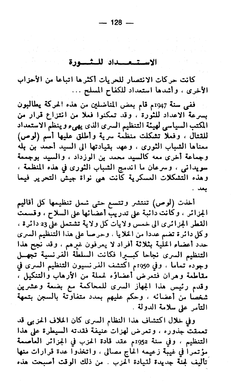 وكل دائرة تضم عددا من الخلايا. وحرصا على هذا التنظيم السري حدد أعضاء الخلية بثلاثة أفراد لا يعرفون غيرهم، وقد نجح هذا التنظيم السري نجاحا كبيرا فكانت السلطة الفرنسية تجهل وجوده تماما، وفي 1955م اكتشف الفرنسيون التنظيم السرى في مقاطعة وهران فتعرض أعضاؤه لحملة من الإرهاب والتنكيل، وقدم رئيس هذا الجهاز السرى للمحاكمة مع بضعة وعشرين شخصا من أعضائه، وحكم عليهم بمدد متفاوتة بالسجن بتمهه التآمر على سلامة الدولة.