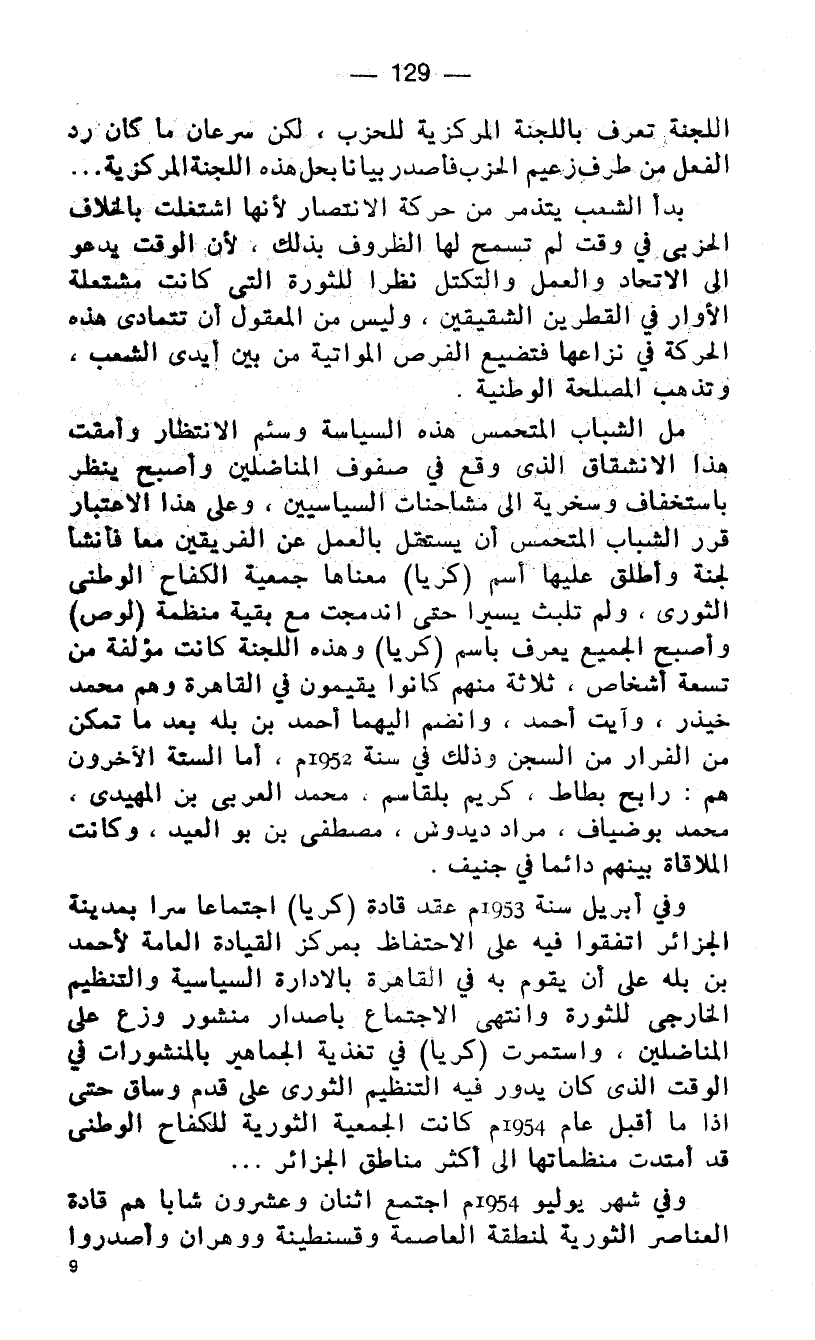 وفي أبريل سنة 1953م عقد قادة (كريا) اجتماعا سرا بمدينة الجزائر اتفقوا فيه على الاحتفاظ بمركز القيادة العامة لأحمد بن بله على أن يقوم به في القاهرة بالإدارة السياسية والتنظيم الخارجي للثورة وانتهى الاجتماع بإصدار منشور وزع على المناضلين، واستمرت (كريا) في تغذية الجماهير بالمنشورات في الوقت الذى كان يدور فيه التنظيم الثوري على قدم وساق حتى اذا ما أقبل عام 1954م كانت الجمعية الثورية للكفاح الوطني قد امتدت منظماتها الى أكثر مناطق الجزائر ...