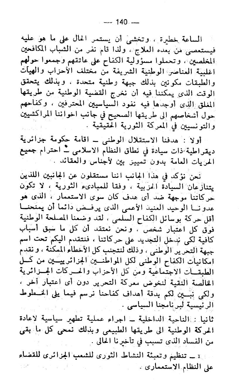 أولا: هدفنا الاستقلال الوطني - إقامة حكومة جزائرية ديمقراطية ذات سيادة في نطاق النظام الإسلامي - احترام جميع الحريات العامة بدون تمييز بين الأجناس والعقائد.