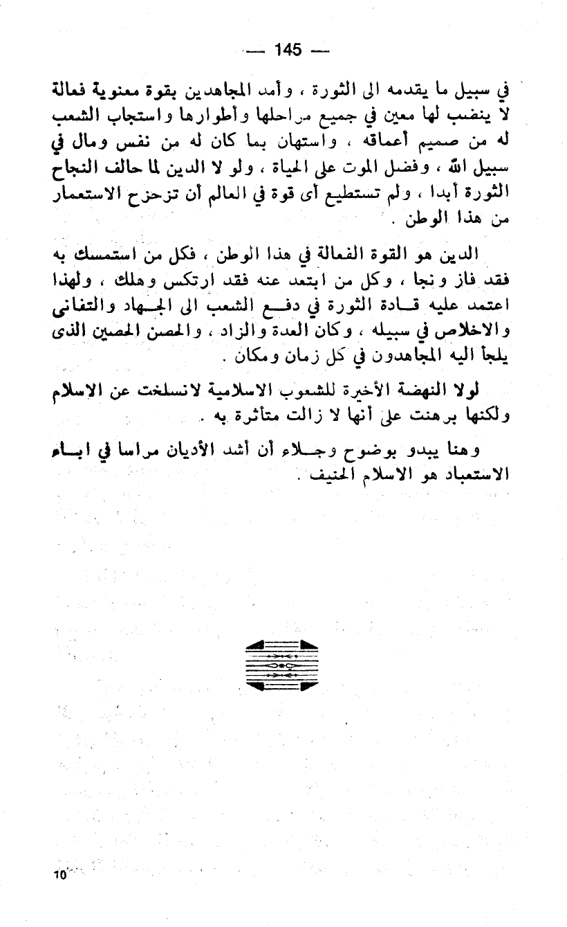 في سبيل ما يقدمه الى الثورة، وأمد المجاهدين بقوة معنوية فعالة لا ينضب لها معين في جميع مراحلها وأطوارها واستجاب الشعب له من صميم أعماقه، واستهان بما كان له من نفس ومال في سبيل الله، وفضل الموت على الحياة، ولولا الدين لما حالف النجاح الثورة أبدا، ولم تستطيع أي قوة في العالم أن تزحزح الاستعمار من هذا الوطن.