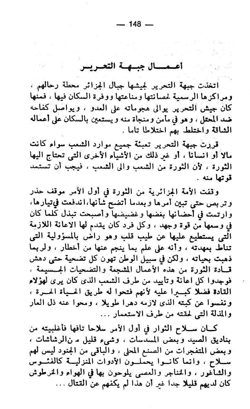 وقفت الأمة الجزائرية من الثورة في أول الأمر موقف حذر وتربص حتى تبين أمرها وبعدما اتضح شأنها، اندفعت في تيارها، وارتمت في أحضانها بغضها وغضيضها وأصبحت تبذل كلما كان في وسعها من قوة وجهد، وكل فرد كان يقدم لها الاعانة اللازمة التي يستطيع عليها عن طيب قلب وهو راض بالمسؤولية التي تناط بعهدته، وأنه على علم بما ينجم عنها من أخطار، ولربما ذهبت بحياته، ولكن في سبيل الوطن تهون كل تضحية حتى دهش قادة الثورة من هذه الأعمال المشجعة والتضحيات الجسيمة، فوجدوا كل إعانة وتأييد من طرف الشعب الذى كان يرى لهؤلاء القادة فضلا كبيرا عليه لأنهم فتحوا له طريق الحياة الحرة، ونفسوا عن كبته الذى لازمه دهرا طويلا، ومحوا عنه ذل العار والمذلة التي لحقته من طرف الاستعمار ...