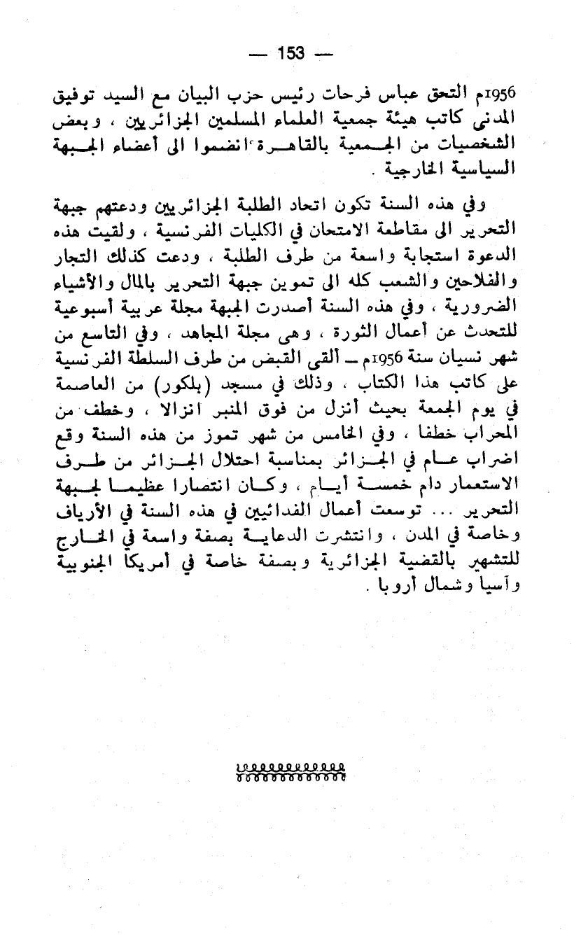 وفي هذه السنة تكون اتحاد الطلبة الجزائريين ودعتهم جبهة التحرير الى مقاطعة الامتحان في الكليات الفرنسية، ولقيت هذه الدعوة استجابة واسعة من طرف الطلبة، ودعت كذلك التجار والفلاحين والشعب كله الى تموين جبهة التحرير بالمال والأشياء الضرورية، وفي هذه السنة أصدرت الجبهة مجلة عربية أسبوعية للتحدث عن أعمال الثورة، وهى مجلة المجاهد، وفي التاسع من شهر نيسان سنة 1956م - ألقي القبض من طرف السلطة الفرنسية على كاتب هذا الكتاب، وذلك في مسجد (بلكور) من العاصمة في يوم الجمعة بحيث أنزل من فوق المنبر انزالا، وخطف من المحراب خطفا، وفي الخامس من شهر تموز من هذه السنة وقع إضراب عام في الجزائر بمناسبة احتلال الجزائر من طرف الاستعمار دام خمسة أيام، وكان انتصارا عظيما لجبهة التحرير ... توسعت أعمال الفدائيين في هذه السنة في الأرياف وخاصة في المدن، وانتشرت الدعاية بصفة واسعة في الخارج للتشهير بالقضية الجزائرية وبصفة خاصة في أمريكا الجنوبية وآسيا وشمال أروبا.