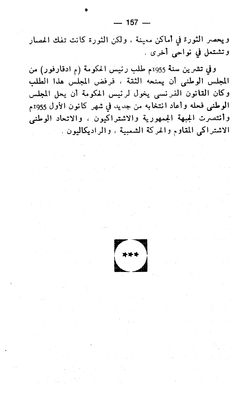 وفي تشرين سنة 1955م طلب رئيس الحكومة (م ادقارفور) من المجلس الوطني أن يمنحه الثقة، فرفض المجلس هذا الطلب وكان القانون الفرنسي يخول لرئيس الحكومة أن يحل المجلس الوطني فحله وأعاد انتخابه من جديد في شهر كانون الأول 1955 م وانتصرت الجبهة الجمهورية والاشتراكيون، والاتحاد الوطني الاشتراكي المقاوم والحركة الشعبية، والراديكاليون.