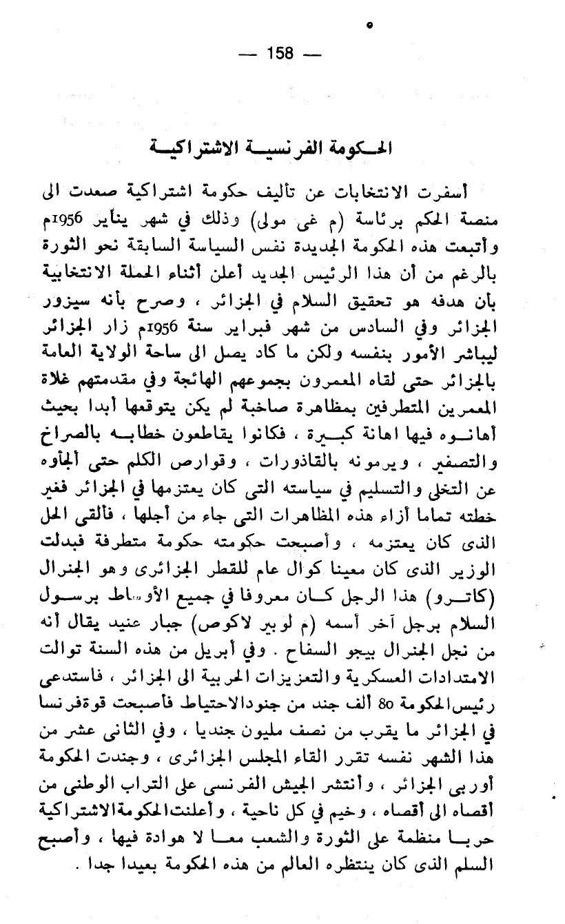 أسفرت الانتخابات عن تأليف حكومة اشتراكية صعدت الى منصة الحكم برئاسة (م غى مولى) وذلك في شهر يناير 1956 م وأتبعت هذه الحكومة الجديدة نفس السياسة السابقة نحو الثورة بالرغم من أن هذا الرئيس الجديد أعلن أثناء الحملة الانتخابية بأن هدفه هو تحقيق السلام في الجزائر، وصرح بأنه سيزور الجزائر وفي السادس من شهر فبراير سنة 1956م زار الجزائر ليباشر الأمور بنفسه ولكن ما كاد يصل الى ساحة الولاية العامة بالجزائر حتى لقاه المعمرون بجموعهم الهائجة وفى مقدمتهم غلاة المعمرين المتطرفين بمظاهرة صاخبة لم يكن يتوقعها أبدا بحيث أهانوه فيها إهانة كبيرة، فكانوا يقاطعون خطابه بالصراخ والتصفير، ويرمونه بالقاذورات، وقوارص الكلم حتى ألجأوه عن التخلي والتسليم في سياسته التي كان يعتزمها في الجزائر فغير خطته تماما إزاء هذه المظاهرات التي جاء من أجلها، فألقى الحل الذي كان يعتزمه، وأصبحت حكومته حكومة متطرفة فبدلت الوزير الذى كان معينا كوال عام للقطر الجزائري وهو الجنرال) كاترو) هذا الرجل كان معروفا في جميع الأوساط برسول السلام برجل آخر اسمه (م لوبير لاكوص) جبار عنيد لقال أنه من نجل الجنرال بيجو السفاح. وفي أبريل من هذه السنة توالت الامتدادات العسكرية والتعزيزات الحربية الى الجزائر، فاستدعى رئيس الحكومة 80 ألف جند من جنود الاحتياط فأصبحت قوة فرنسا في الجزائر ما يقرب من نصف مليون جنديا، وفي الثاني عشر من هذا الشهر نفسه تقرر القاء المجلس الجزائري، وجندت الحكومة أوربى الجزائر، وأنتشر الجيش الفرنسي على التراب الوطني من أقصاه الى أقصاه، وخيم في كل ناحية، وأعلنت الحكومة الاشتراكية حربا منظمة على الثورة والشعب معا لا هوادة فيها، وأصبح السلم الذى كان ينتظره العالم من هذه الحكومة بعيدا جدا.