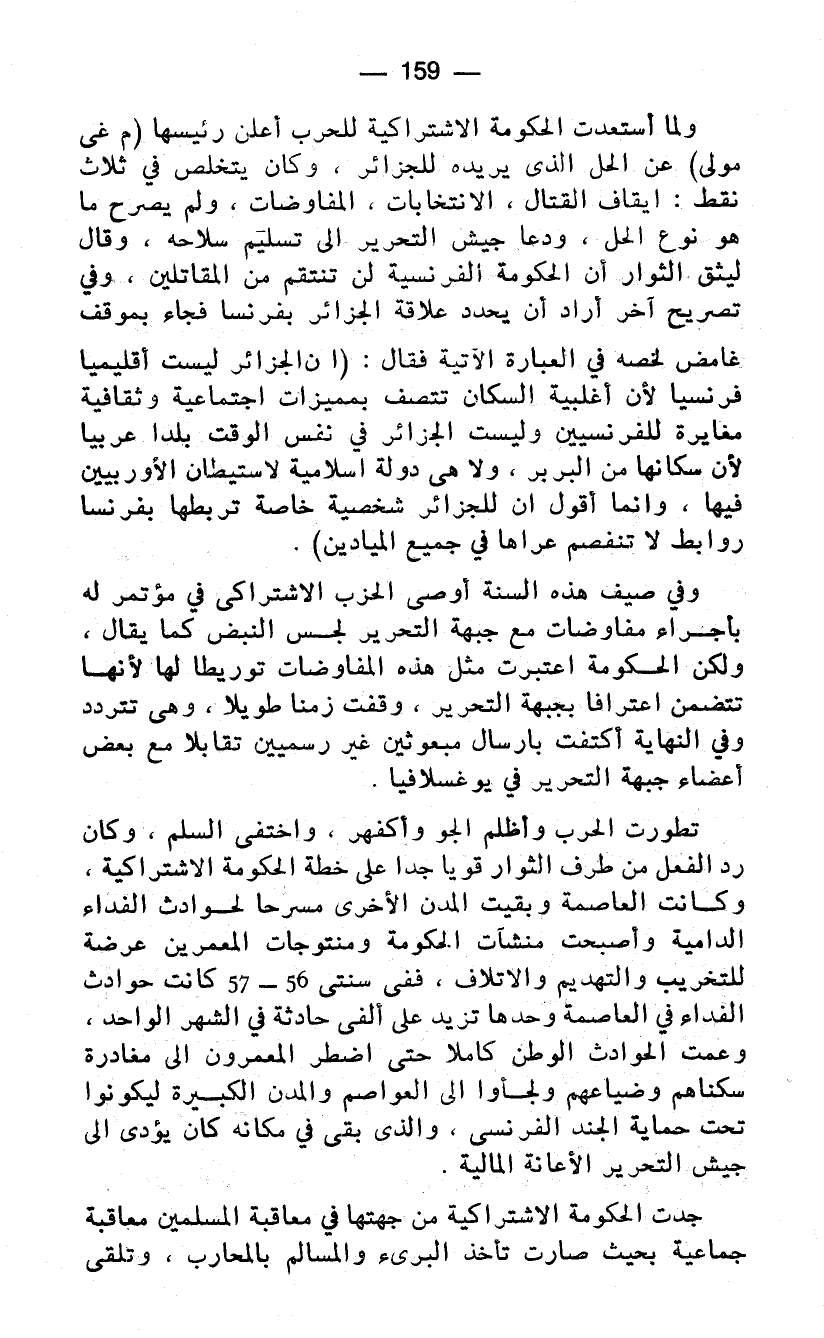 ولما استعدت الحكومة الاشتراكية للحرب أعلن رئيسها (م غى مولى) عن الحل الذي يريده للجزائر، وكان يتخلص في ثلاث نقط: إيقاف القتال، الانتخابات، المفاوضات، ولم يصرح ما هو نوع الحل، ودعا جيش التحرير الى تسليم سلاحه، وقال ليثق الثوار أن الحكومة الفرنسية لن تنتقم من المقاتلين، وفي تصريح آخر أراد أن يحدد علاقة الجزائر بفرنسا فجاء بموقف غامض لخصه في العبارة الآتية فقال: (ان الجزائر ليست إقليميا فرنسيا لأن أغلبية السكان تتصف بمميزات اجتماعية وثقافية مغايرة للفرنسيين وليست الجزائر في نفس الوقت بلدا عربيا لأن سكانها من البربر. ولا هي دولة اسلامية لاستيطان الأوربيين فيها، وانما أقول ان للجزائر شخصيه خاصة تربطها بفرنسا روابط لا تنفصم عراها في جميع الميادين (.