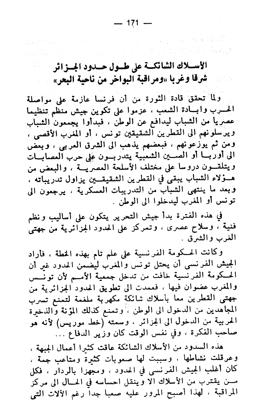 وكانت الحكومة الفرنسية على علم تام بهذه الخطة، فأراد الجيش الفرنسي أن يحمل تونس والمغرب ليضمن الحدود غير أن الحكومة الفرنسية خافت من تدخل جمعية الأمم لأن تونس والمغرب عضوان فيها، فعمدت الى تطويق الحدود الجزائرية من جهتي القطرين معا بأسلاك شائكة مكهربة ملغمة لتمنع تسرب المجاهدين من الدخول الى الوطن، وتمنع كذلك المؤنة والذخيرة الحربية من الدخول الى الجزائر، وسمته (خط موريس) لأنه هو صاحب الفكرة، وفي نفس الوقت كان وزير الدفاع ...