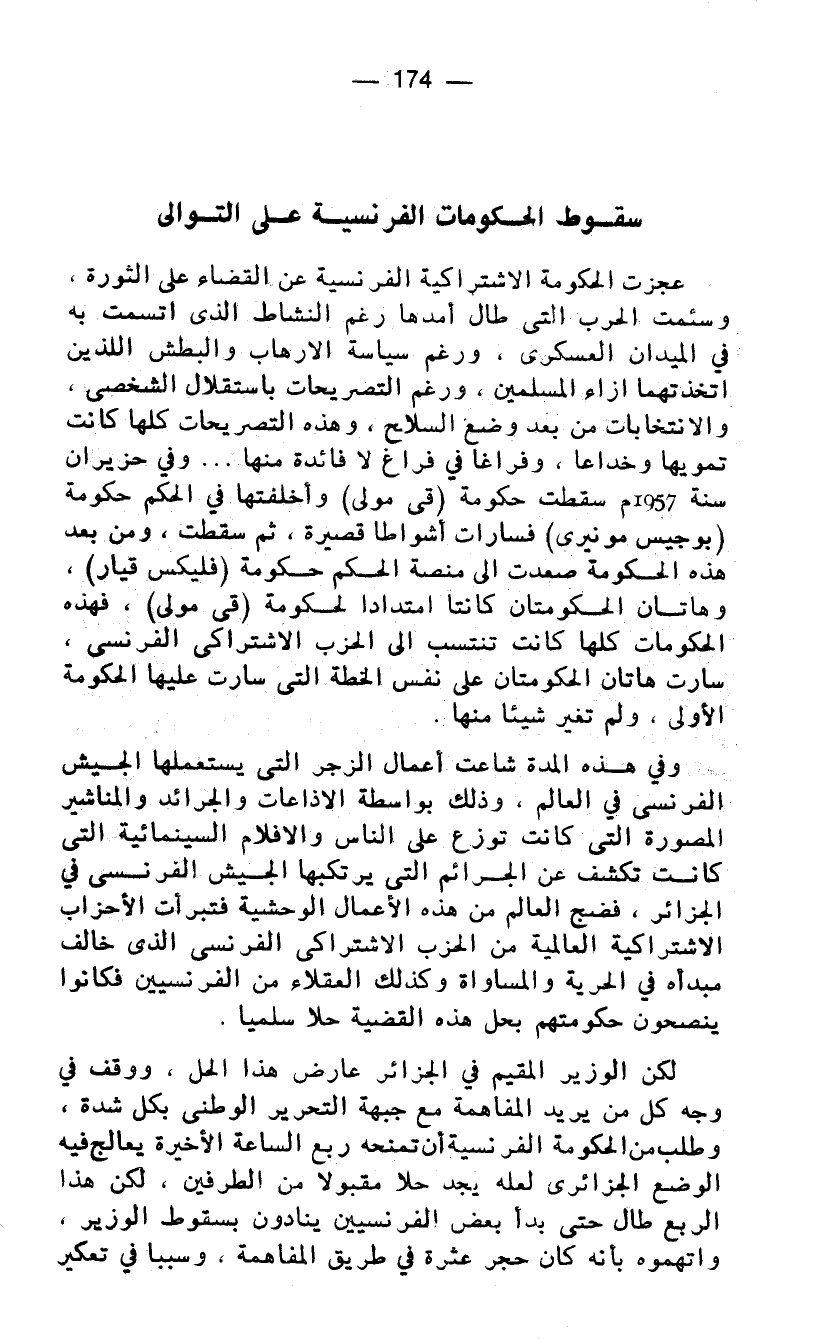 عجزت الحكومة الاشتراكية الفرنسية عن القضاء على الثورة وسئمت الحرب التي طال أمدها رغم النشاط الذى اتسمت به في الميدان العسكري، ورغم سياسة الارهاب والبطش اللذين اتخذتهما إزاء المسلمين، ورغم التصريحات باستقلال الشخصي والانتخابات من بعد وضع السلاح، وهذه التصريحات كلها كانت تمويها وخداعا، وفراغا في فراغ لا فائدة منها ... وفي حزيران سنة 1957م سقطت حكومة (قى مولى) وأخلفتها في الحكم حكومة) بوجيس مونيري) فسارت أشواطا قصيرة، ثم سقطت، ومن بعد هذه الحكومة صعدت الى منصة الحكم حكومة (فليكس قيار)، وهاتان الحكومتان كانتا امتدادا لحكومة (قى مولى)، فهذه الحكومات كلها كانت تنتسب الى الحزب الاشتراكي الفرنسي، سارت هاتان الحكومتان على نفس الخطة التي سارت عليها الحكومة الأولى، ولم تغير شيئا منها.