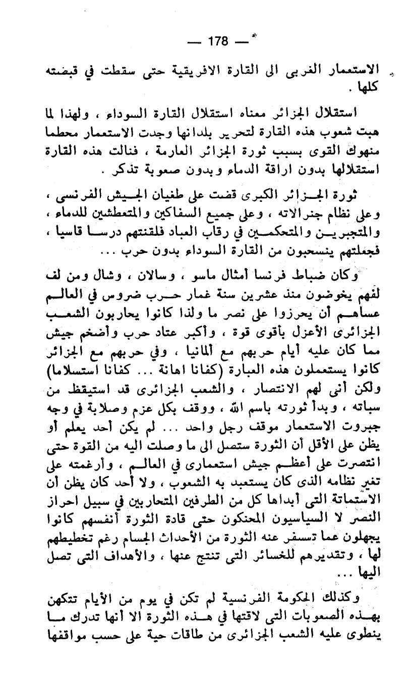 استقلال الجزائر معناه استقلال القارة السوداء، ولهذا لما هبت شعوب هذه القارة لتحرير بلدانها وجدت الاستعمار محطما منهوك القوى بسبب ثورة الجزائر العارمة، فنالت هذه القارة استقلالها بدون إراقة الدماء وبدون صعوبة تذكر.