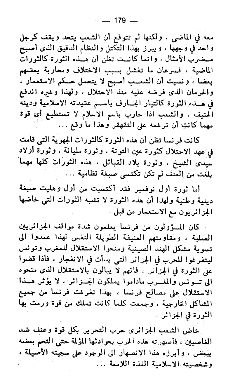 كانت فرنسا تظن أن هذه الثورة كالثورات الجهوية التي قامت في عهد الاحتلال كثورة عين التوتة، وثورة مليانة، وثورة أولاد سيدي الشيخ، وثورة بلاد القبائل، هذه الثورات كلها مهما بلغت من العنف لم تكن تكتسي صبغة نظامية ...