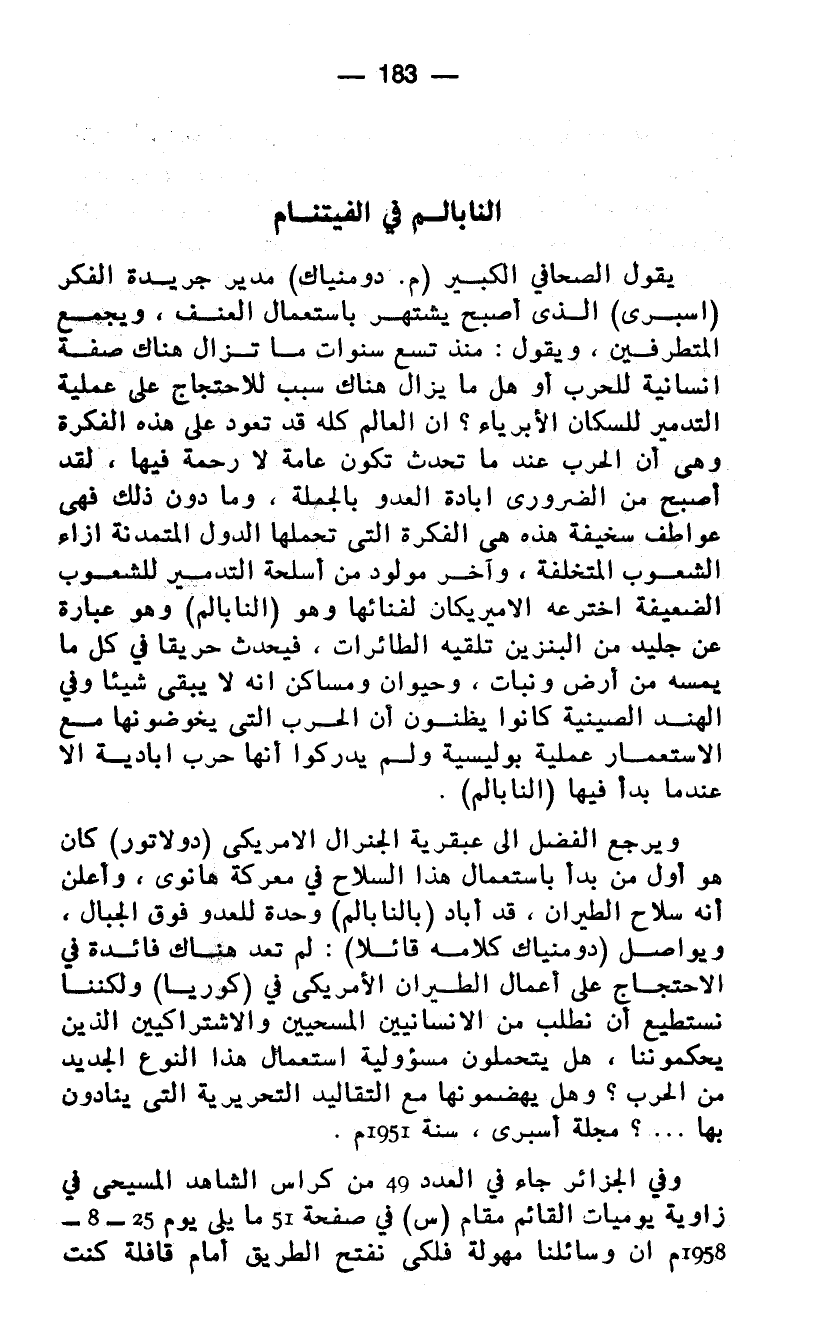 يقول الصحافي الكبير (م. دومنياك) مدير جريدة الفكر (اسبرى) الذي أصبح يشتهر باستعمال العنف، ويجمع المتطرفين، ويقول: منذ تسع سنوات ما تزال هناك صفة إنسانية للحرب أو هل ما يزال هناك سبب للاحتجاج على عملية التدمير للسكان الأبرياء؟ ان العالم كله قد تعود على هذه الفكرة وهى أن الحرب عندما تحدث تكون عامة لا رحمة فيها، لقد أصبح من الضروري إبادة العدو بالجملة، وما دون ذلك فهي عواطف سخيفة هذه هي الفكرة التي تحملها الدول المتمدنة إزاء الشعوب المتخلفة، وآخر مولود من أسلحة التدمير للشعوب الضعيفة اخترعه الأمريكان لفنائها وهو (النابالم) وهو عبارة عن جليد من البنزين تلقيه الطائرات، فيحدث حريقا في كل ما يمسه من أرض ونبات، وحيوان ومساكن إنه لا يبقي شيئا وفي الهند الصينية كانوا يظنون أن الحرب التي يخوضونها مع الاستعمار عملية بوليسية ولم يدركوا أنها حرب إبادية الا عندما بدأ فيها (النابالم).