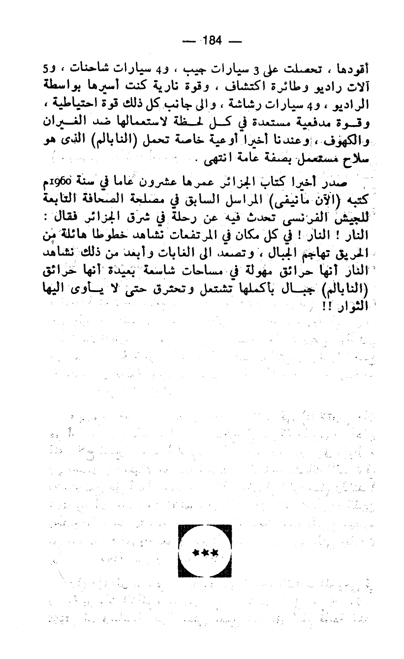 صدر أخيرا كتاب الجزائر عمرها عشرون عاما في سنة 1960 م كتبه (الآن مانيفى) المراسل السابق في مصلحة الصحافة التابعة للجيش الفرنسي تحدث فيه عن رحلة في شرق الجزائر فقال: النار! النار! في كل مكان في المرتفعات نشاهد خطوطا هائلة من الحريق تهاجم الجبال، وتصعد الى الغابات وأبعد من ذلك نشاهد النار أنها حرائق مهولة في مساحات شاسعة بعيدة أنها حرائق) النابالم) جبال بأكملها تشتعل وتحترق حتى لا يأوي إليها الثوار!!