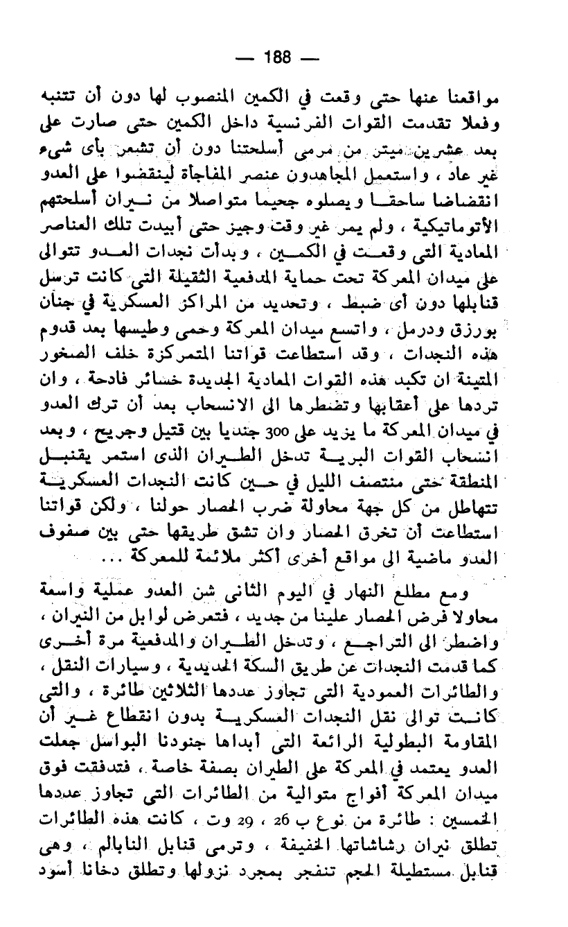 مواقعنا عنها حتى وقعت في الكمين المنصوب لها دون أن تتنبه وفعلا تقدمت القوات الفرنسية داخل الكمين حتى صارت على بعد عشرين ميتر من مرمى أسلحتنا دون أن تشعر بأي شيء غير عاد، واستعمل المجاهدون عنصر المفاجأة لينقضوا على العدو انقضاضا ساحقا ويصلوه جحيما متواصلا من نيران أسلحتهم الأتوماتيكية، ولم يمر غير وقت وجيز حتى أبيدت تلك العناصر المعادية التي وقعت في الكمين، وبدأت نجدات العدو تتوالى على ميدان المعركة تحت حماية المدفعية الثقيلة التي كانت ترسل قنابلها دون أي ضبط، وتحديد من المراكز العسكرية في جنان بورزق ودرمل، واتسع ميدان المعركة وحمى وطيسها بعد قدوم هذه النجدات، وقد استطاعت قواتنا المتمركزة خلف الصخور المتينة أن تكبد هذه القوات المعادية الجديدة خسائر فادحة، وأن تردها على أعقابها وتضطرها الى الانسحاب بعد أن ترك العدو في ميدان المعركة ما يزيد على 300 جنديا بين قتيل وجريح، وبعد انسحاب القوات البرية تدخل الطيران الذى استمر يقنبل المنطقة حتى منتصف الليل في حين كانت النجدات العسكرية تتهاطل من كل جهة محاولة ضرب الحصار حولنا، ولكن قواتنا استطاعت أن تخرق الحصار وان تشق طريقها حتى بين صفوف العدو ماضية الى مواقع أخرى أكثر ملائمة للمعركة ...