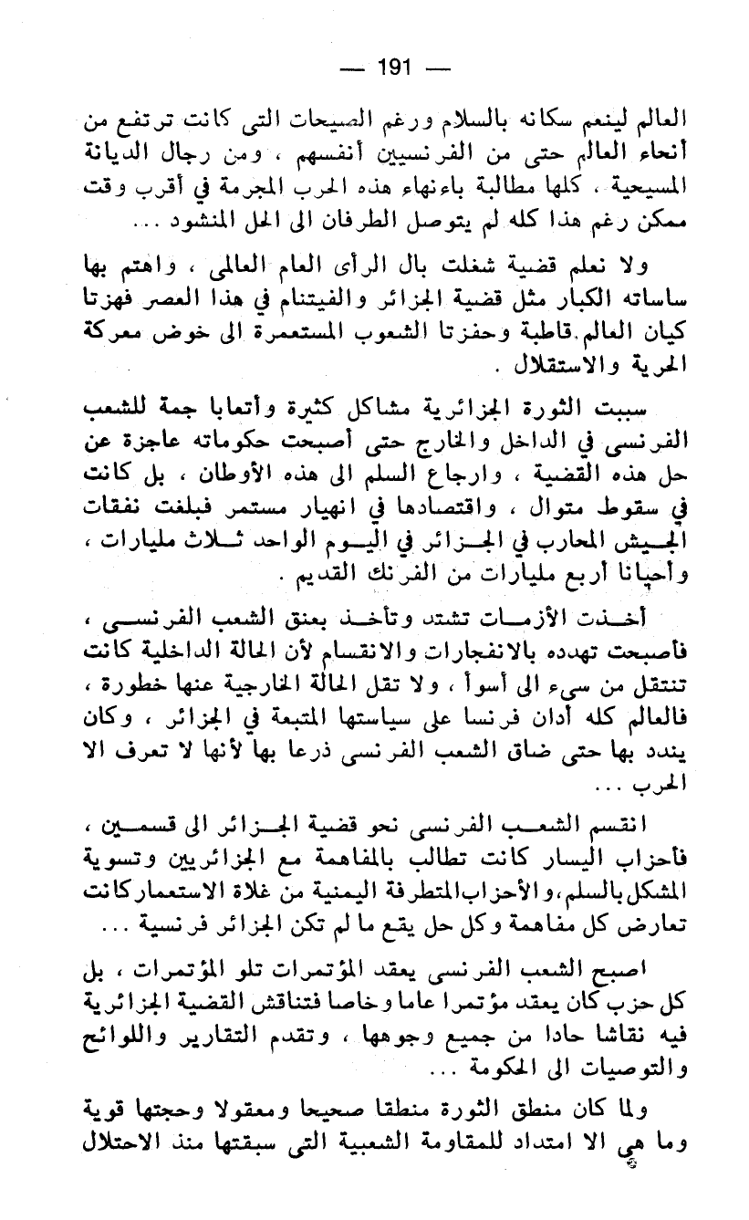 العالم لينعم سكانه بالسلام ورغم الصيحات التي كانت ترتفع من أنحاء العالم حتى من الفرنسيين أنفسهم، ومن رجال الديالة المسيحية. كلها مطالبة بإنهاء هذه الحرب المجرمة في أقرب وقت ممكن رغم هذا كله لم يتوصل الطرفان الى الحل المنشود ...