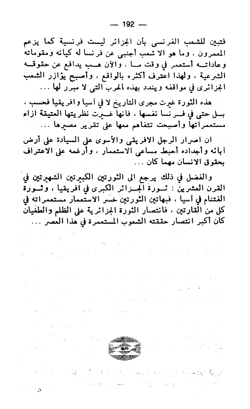 والفضل في ذلك يرجع الى الثورتين الكبيرتين الشهيرتين في القرن العشرين: ثورة الجزائر الكبرى في افريقيا، وثورة الفتنام في آسيا، فبهاتين الثورتين خسر الاستعمار مستعمراته في كل من القارتين، فانتصار الثورة الجزائرية على الظلم والطغيان كان أكبر انتصار حققته الشعوب المستعمرة في هذا العصر ...