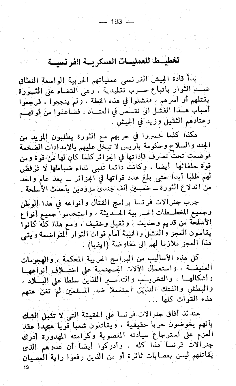 جرب جنرالات فرنسا برامج القتال وأنواعه في هذا الوطن وجميع المخططات الحربية الحديثة، واستخدموا جميع أنواع الأسلحة من قديم وحديث، وثقيل وخفيف، ومع هذا كله كانوا يقاسون العجز والفشل والخيبة أمام قوات الثوار المتواضعة وبقي هذا العجز ملازما لهم الى مفاوضة (إيفيا (.