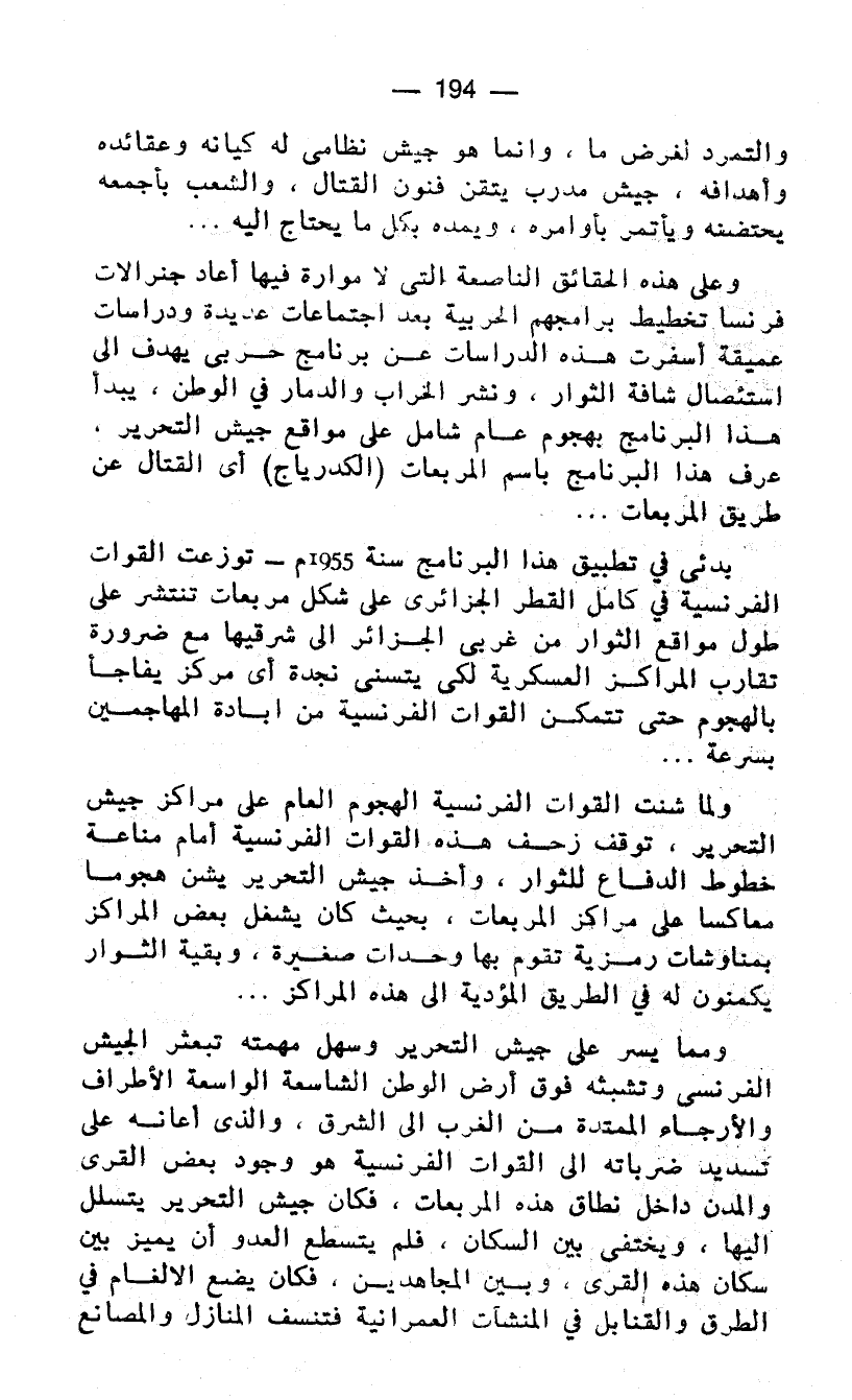 وعلى هذه الحقائق الناصعة التي لا موارة فيها أعاد جنرالات فرنسا تخطيط برامجهم الحربية بعد اجتماعات عديدة ودراسات عميقة أسفرت هذه الدراسات عن برنامج حربى يهدف الى استئصال شأفة الثوار، ونشر الخراب والدمار في الوطن، يبدأ هذا البرنامج بهجوم عام شامل على مواقع جيش التحرير، عرف هذا البرنامج باسم المربعات (الكدرياج) أي القتال عن طريق المربعات ...