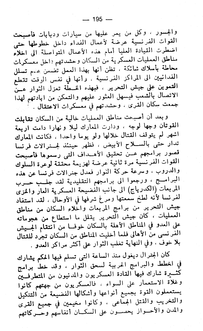 والجسور، وكل من يمر عليها من سيارات ودبابات فأصبحت القوات الفرنسية عرضة لأعمال الفداء داخل خطوطها حتى اضطرت القيادة العليا أمام هذه الأعمال المتواصلة الى إخلاء مناطق العمليات العسكرية من السكان وحشدتهم داخل معسكرات محاطة بأسلاك شائكة، تظن أنها بهذا العمل تضمن عدم تسلل الفدائيين الى المراكز الفرنسية، وأنها في نفس الوقت تقطع التموين على جيش التحرير، فبهذه الخطة تعزل الثوار عن الاتصال بالشعب فيسهل العثور عليهم والتمكن من إبادتهم لهذا جمعت سكان القرى، وحشدتهم في معسكرات الاعتقال.