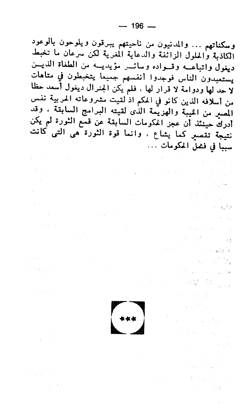 وسكناتهم ... والمدنيون من ناحيتهم يبرقون ويلوحون بالوعود الكاذبة والحلول الزائفة والدعاية المغرية لكن سرعان ما تخبط ديغول وأتباعه وقواده وسائر مؤيديه من الطغاة الذين يستعبدون الناس فوجدوا أنفسهم جميعا يتخبطون في متاهات لا حد لهما ودوامة لا قرار لها، فلم يكن الجنرال ديغول أسعد حظا من أسلافه الذين كانوا في الحكم إذ لقيت مشروعاته الحربية نفس المصير من الخيبة والهزيمة الذى لقيته البرامج السابقة، وقد أدرك حينئذ أن عجز الحكومات السابقة عن قمع الثورة لم يكن نتيجة تقصير كما يشاع، وإنما قوة الثورة هي التي كانت سببا في فشل الحكومات ...