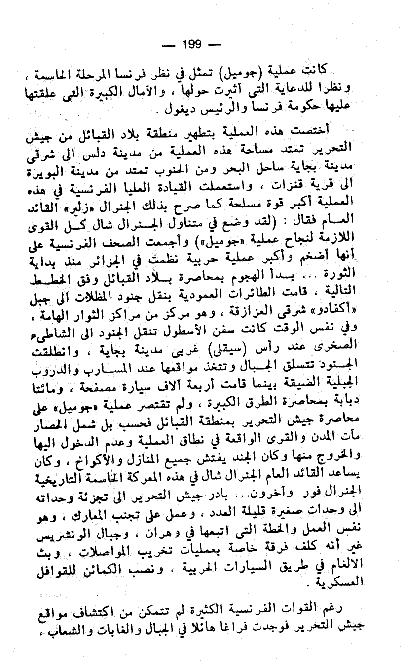 اختصت هذه العملية بتطهير منطقة بلاد القبائل من جيش التحرير تمتد مساحة هذه العملية من مدينة دلس الى شرقي مدينة بجاية ساحل البحر ومن الجنوب تمتد من مدينة البويرة الى قرية قنزات، واستعملت القيادة العليا الفرنسية في هذه العملية أكبر قوة مسلحة كما صرح بذلك الجنرال ((زلير)) القائد العام فقال: (لقد وضع في متناول الجنرال شال كل القوى اللازمة لنجاح عملية "جوميل") وأجمعت الصحف الفرنسية على أنها أضخم وأكبر عملية حربية نظمت في الجزائر منذ بداية الثورة ... بدأ الهجوم بمحاصرة بلاد القبائل وفق الخطط التالية، قامت الطائرات العمودية بنقل جنود المظلات الى جبل "أكلفادو" شرقي العزازقة، وهو مركز من مراكز الثوار الهامة، وفي نفس الوقت كانت سفن الأسطول تنقل الجنود الى الشاطئ الصخري عند رأس (سيقلي) غربي مدينة بجاية، وانطلقت الجنود تتسلق الجبال وتتخذ مواقعها عند المسارب والدروب الجبلية الضيقة بينما قامت أربعة آلاف سيارة مصفحة، ومائتا دبابة بمحاصرة الطرق الكبيرة، ولم تقتصر عملية "جوميل" على محاصرة جيش التحرير بمنطقة القبائل فحسب بل شمل الحصار مآت المدن والقرى الواقعة في نطاق العملية وعدم الدخول إليها والخروج منها وكان الجند يفتش جميع المنازل والأكواخ، وكان يساعد القائد العام الجنرال شال في هذه المعركة الخامسة التاريخية الجنرال فور وآخرون ... بادر جيش التحرير الى تجزئة وحداته الى وحدات صغيرة قليلة العدد، وعمل على تجنب المعارك، وهو نفس العمل والخطة التي اتبعها في وهران، وجبال الونشريس غير أنه كلف فرقة خاصة بعمليات تخريب المواصلات، وبث الالغام في طريق السيارات الحربية، ونصب الكمائن للقوافل العسكرية.