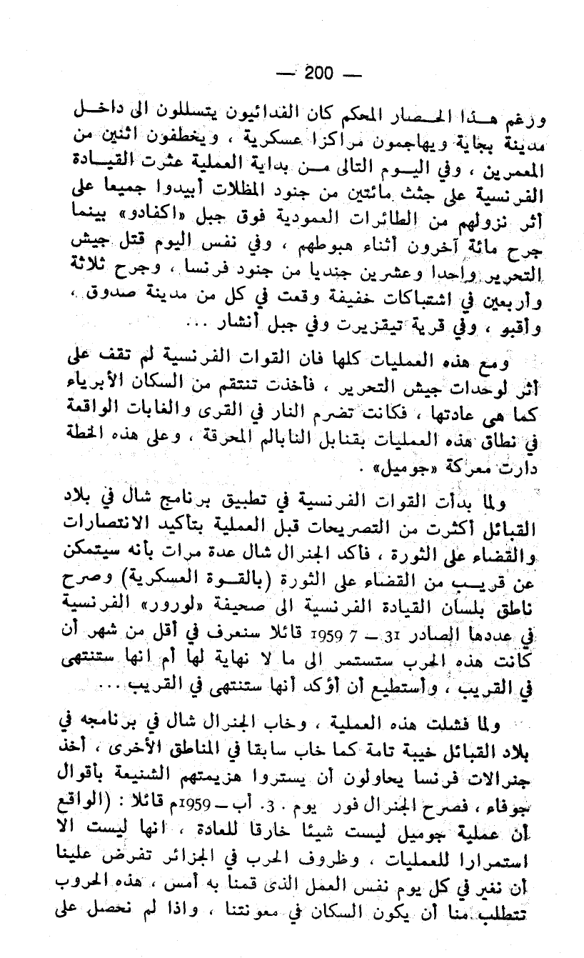 ولما فشلت هذه العملية، وخاب الجنرال شال في برنامجه في بلاد القبائل خيبة تامة كما خاب سابقا في المناطق الأخرى، أخذ جنرالات فرنسا يحاولون أن يستروا هزيمتهم الشنيعة بأقوال جوفاء، فصرح الجنرال فور يوم 3 أب - 1959م قائلا: (الواقع أن عملية جوميل ليست شيئا خارقا للعادة، إنها ليست إلا استمرارا للعمليات، وظروف الحرب في الجزائر تفرض علينا أن نغير في كل يوم نفس العمل الذي قمنا به أمس، هذه الحروب تتطلب منا .. أن يكون السكان في معونتنا، وإذا لم نحصل على