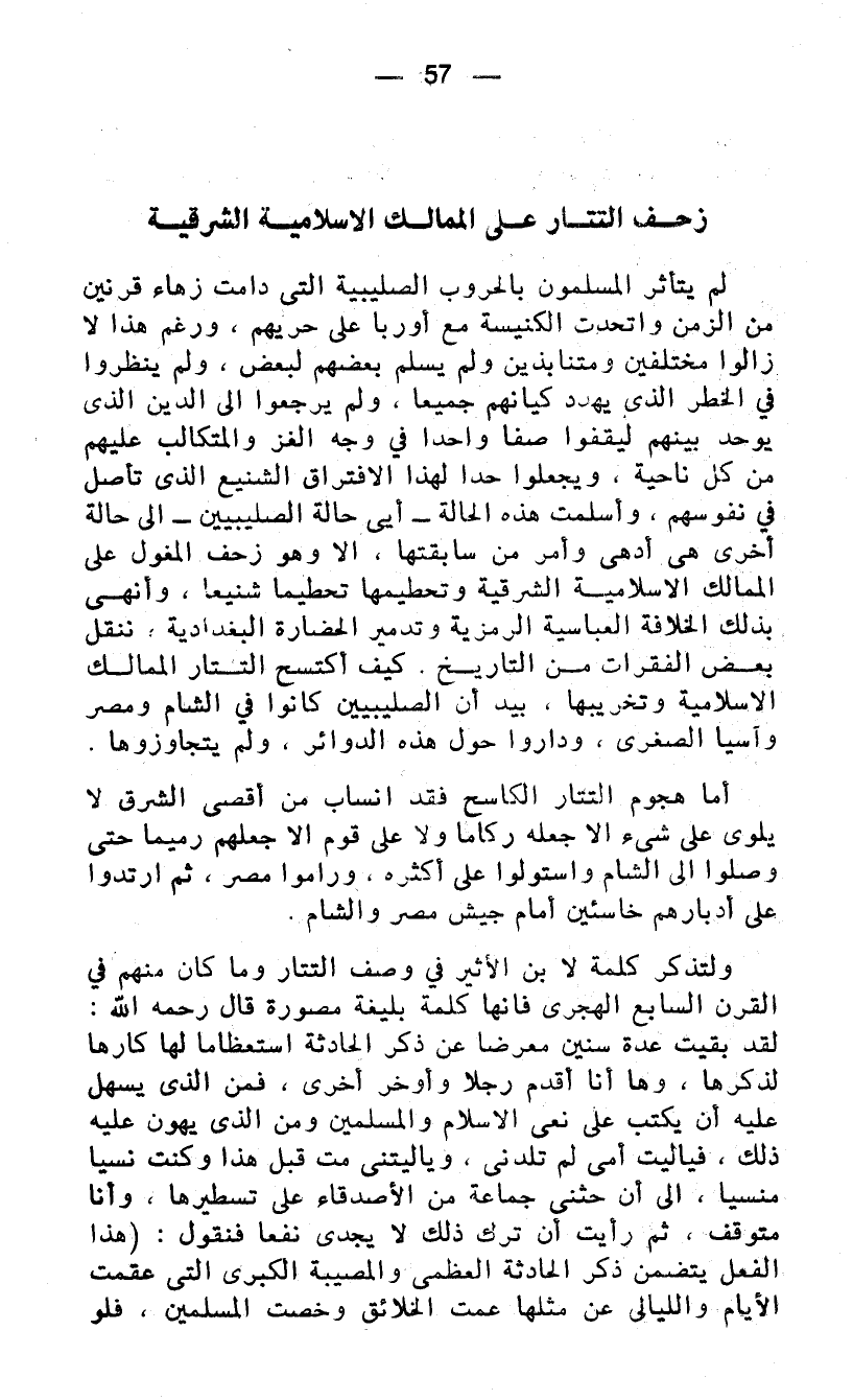 لم يتأثر المسلمون بالحروب الصليبية التي دامت زهاء قرنين من الزمن واتحدت الكنيسة مع أوربا على حريهم، ورغم هذا لا زالوا مختلفين ومتنابذين ولم يسلم بعضهم لبعض، ولم ينظروا في الخطر الذى يهدد كيانهم جميعا، ولم يرجعوا الى الدين الذى يوحد بينهم ليقفوا صفا واحدا في وجه الغزو المتكالب عليهم من كل ناحية، ويجعلوا حدا لهذا الافتراق الشنيع الذى تأصل في نفوسهم، وأسلمت هذه الحالة - اي حالة الصليبيين - الى حالة أخرى هي أدهى وأمر من سابقتها، الا وهو زحف المغول على الممالك الاسلامية الشرقية وتحطيمها تحطيما شنيعا، وأنهى بذلك الخلافة العباسية الرمزية وتدمير الحضارة البغدادية، ننقل بعض الفقرات من التاريخ. كيف اكتسح التتار الممالك الاسلامية وتخريبها. بيد أن الصليبيين كانوا في الشام ومصر وآسيا الصغرى، وداروا حول هذه الدوائر، ولم يتجاوزوها.