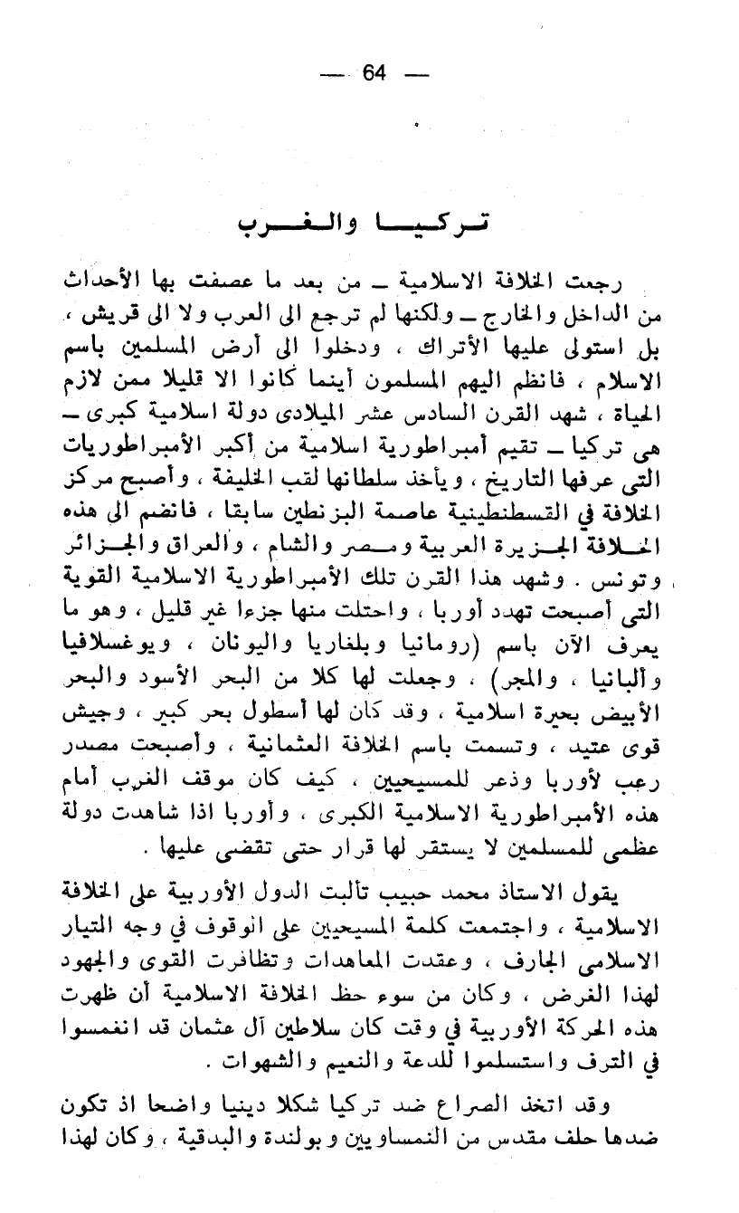 رجعت الخلافة الاسلامية - من بعد ما عصفت بها الأحداث من الداخل والخارج - ولكنها لم ترجع الى العرب ولا الى قريش، بل استولى عليها الأتراك، ودخلوا الى أرض المسلمين باسم الاسلام، فانظم اليهم المسلمون أينما كانوا الا قليلا ممن لازم الحياة، شهد القرن السادس عشر الميلادي دولة إسلامية كبرى - هي تركيا - تقيم إمبراطورية اسلامية من أكبر الإمبراطوريات التي عرفها التاريخ، ويأخذ سلطانها لقب الخليفة، وأصبح مركز الخلافة في القسطنطينية عاصمة البيزنطيين سابقا، فانضم الى هذه الخلافة الجزيرة العربية ومصر والشام، والعراق والجزائر وتونس. وشهد هذا القرن تلك الإمبراطورية الاسلامية القوية التي أصبحت تهدد أوربا، واحتلت منها جزءا غير قليل، وهو ما يعرف الآن باسم (رومانيا وبلغاريا واليونان، ويوغسلافيا وألبانيا، والمجر)، وجعلت لها كلا من البحر الأسود والبحر الأبيض بحيرة اسلامية، وقد كان لها أسطول بحر كبير، وجيش قوى عتيد، وتسمت باسم الخلافة العثمانية، وأصبحت مصدر رعب لأوربا وذعر للمسيحيين، كيف كان موقف الغرب أمام هذه الإمبراطورية الاسلامية الكبرى، وأوربا إذا شاهدت دولة عظمى للمسلمين لا يستقر لها قرار حتى تقضي عليها.