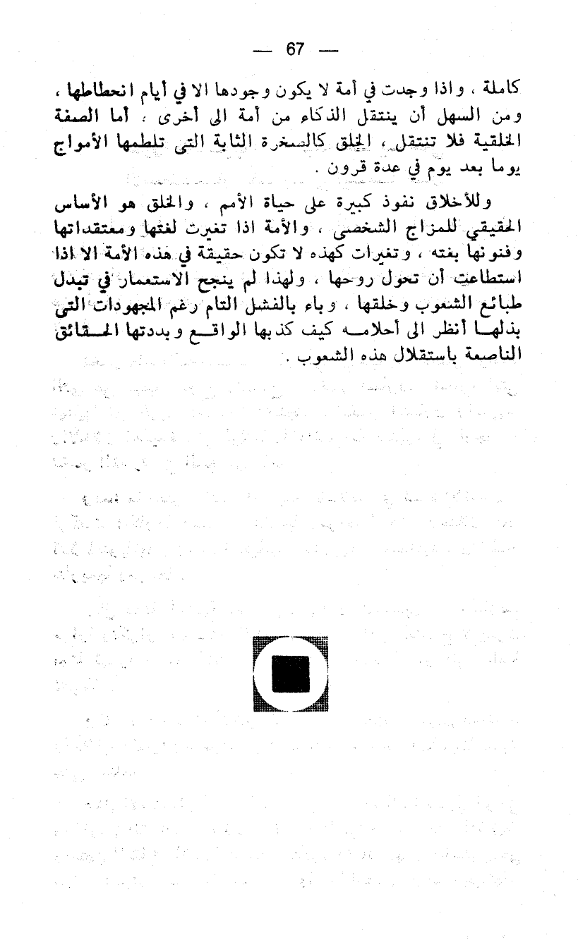 وللأخلاق نفوذ كبيرة على حياة الأمم، والخلق هو الأساس الحقيقي للمزاج الشخصي، والأمة اذا تغيرت لغتها ومعتقداتها وفنونها بغته، وتغيرات كهذه لا تكون حقيقة في هذه الأمة الا إذا استطاعت أن تحول روحها، ولهذا لم ينجح الاستعمار في تبدل طبائع الشعوب وخلقها، وباء بالفشل التام رغم المجهودات التي بذلها أنظر الى أحلامه كيف كذبها الواقع وبددتها الحقائق الناصعة باستقلال هذه الشعوب.