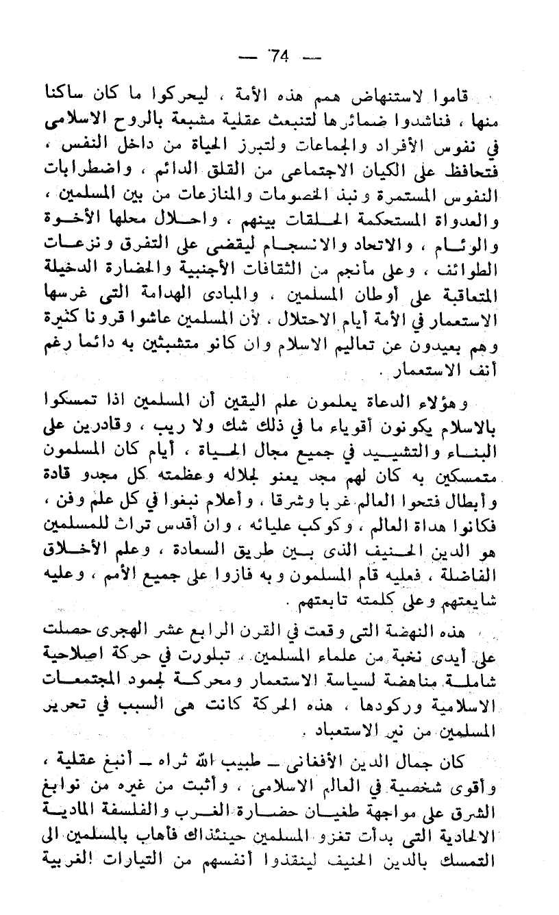 كان جمال الدين الأفغاني - طيب الله ثراه - أنبغ عقلية، وأقوى شخصية في العالم الاسلامي، وأثبت من غيره من نوابغ الشرق على مواجهة طغيان حضارة الغرب والفلسفة المادية الالحادية التي بدأت تغزو المسلمين حينذاك فأهاب بالمسلمين الى التمسك بالدين الحنيف لينقذوا أنفسهم من التيارات الغربية
