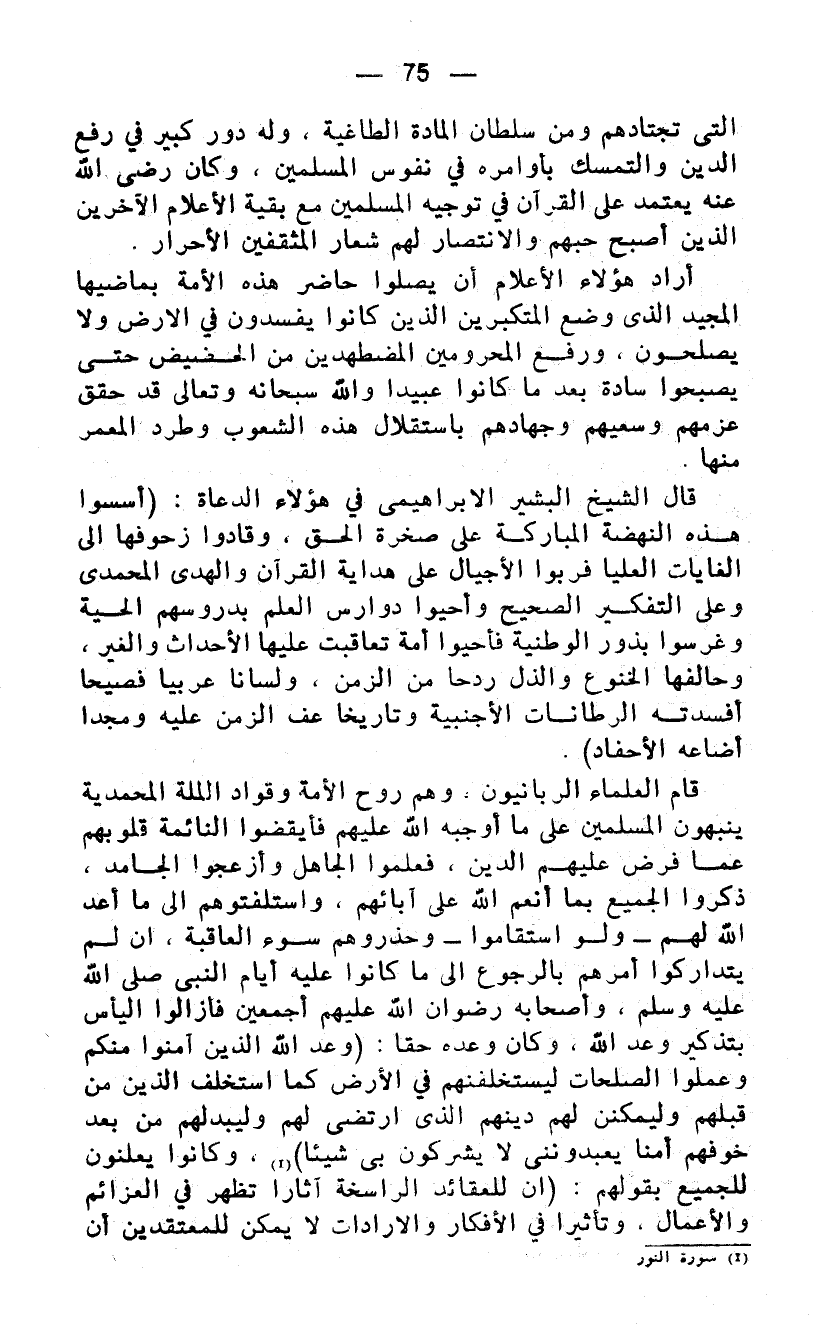 قام العلماء الربانيون، وهم روح الأمة وقواد الملة المحمدية ينبهون المسلمين على ما أوجبه الله عليهم فأيقظوا النائمة قلوبهم عما فرض عليهم الدين، فعلموا الجاهل وأزعجوا الجامد، ذكروا الجميع بما أنعم الله على آبائهم، واستلفتوهم الى ما أعد الله لهم - ولو استقاموا - وحذروهم سوء العاقبة، إن لم يتداركوا أمرهم بالرجوع الى ما كانوا عليه أيام النبي صلى الله عليه وسلم، وأصحابه رضوان الله عليهم أجمعين فأزالوا اليأس بتذكير وعد الله، وكان وعده حقا: {وَعَدَ اللَّهُ الَّذِينَ آمَنُوا مِنْكُمْ وَعَمِلُوا الصَّالِحَاتِ لَيَسْتَخْلِفَنَّهُمْ فِي الْأَرْضِ كَمَا اسْتَخْلَفَ الَّذِينَ مِنْ قَبْلِهِمْ وَلَيُمَكِّنَنَّ لَهُمْ دِينَهُمُ الَّذِي ارْتَضَى لَهُمْ وَلَيُبَدِّلَنَّهُمْ مِنْ بَعْدِ خَوْفِهِمْ أَمْنًا يَعْبُدُونَنِي لَا يُشْرِكُونَ بِي شَيْئًا} (¬1)، وكانوا يعلنون للجميع بقولهم: (ان للعقائد الراسخة آثارا تظهر في العزائم والأعمال، وتأثيرا في الأفكار والإرادات لا يمكن للمعتقدين أن