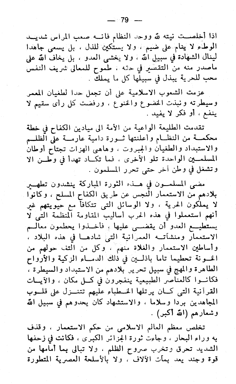 تخلص معظم العالم الإسلامي من حكم الاستعمار، وقذف به وراء البحار. وجاءت ثورة الجزائر الكبرى، فكانت في زحفها الشديد تحرق وتخرب صروح الظلم، ولا تبالى بما أمامها من قوة وجند يعد بمآت الآلاف، ولا بالأسلحة العصرية المتطورة
