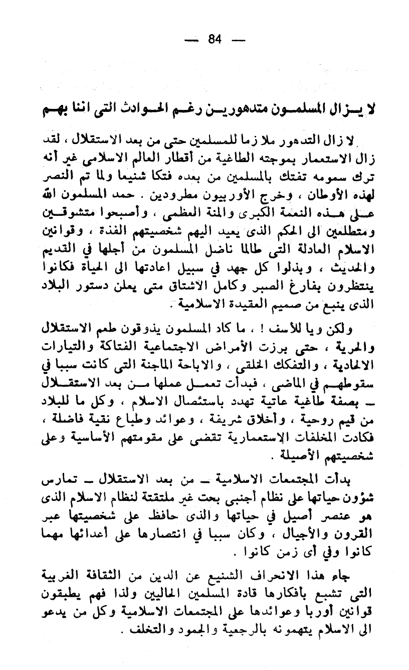 ولكن ويا للأسف!. ما كاد المسلمون يذوقون طعم الاستقلال والحرية، حتى برزت الأمراض الاجتماعية الفتاكة والتيارات الالحادية، والتفكك الخلقي، والاباحة الماجنة التي كانت سببا في سقوطهم في الماضي، فبدأت تعمل عملها من بعد الاستقلال - بصفة طاغية عاتية تهدد باستئصال الاسلام، وكل ما للبلاد من قيم روحية، وأخلاق شريفة، وعوائد وطباع نقية فاضلة، فكادت المخلفات الاستعمارية تقضى على مقومتهم الأساسية وعلى شخصيتهم الأصيلة.