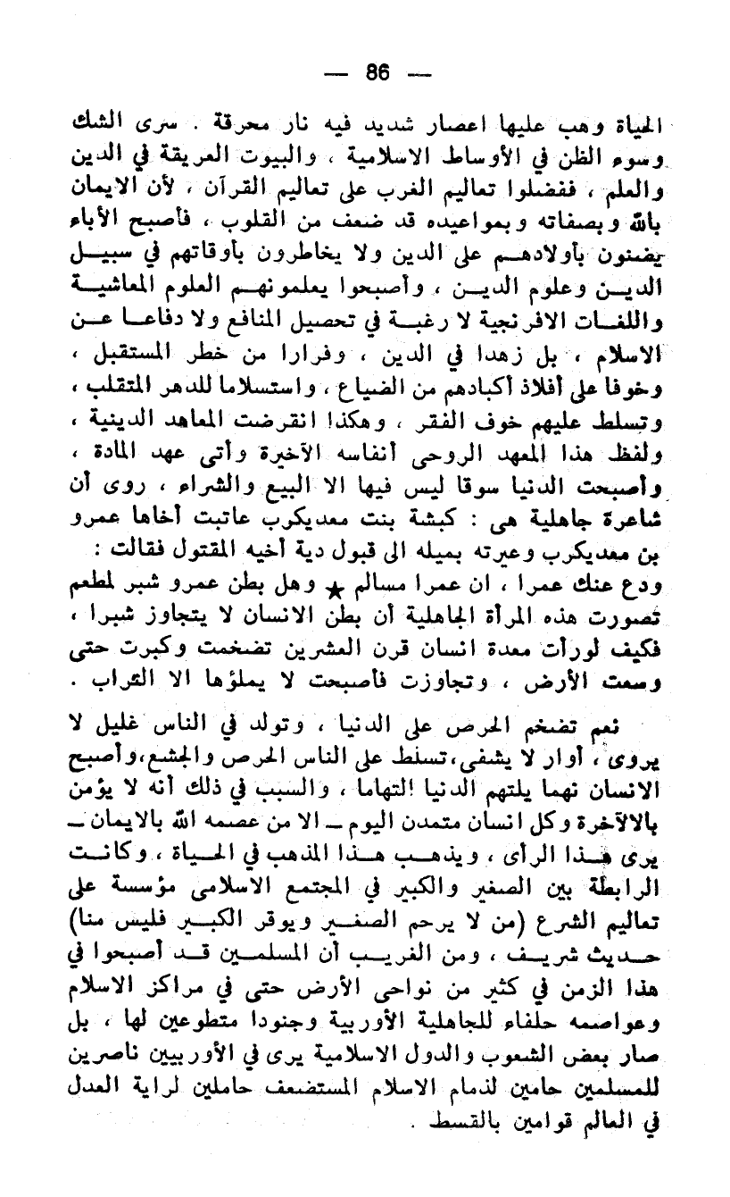 الحياة وهب عليها اعصار شديد فيه نار محرقة. سرى الشك وسوء الظن في الاوساط الاسلامية، والبيوت العريقة في الدين والعلم، ففضلوا تعاليم الغرب على تعاليم القرآن، لأن الايمان بالله وبصفاته وبمواعيده قد ضعف من القلوب، فأصبح الأباء يضنون بأولادهم على الدين ولا يخاطرون بأوقاتهم في سبيل الدين وعلوم الدين، وأصبحوا يعلمونهم العلوم المعاشية واللغات الافرنجية لا رغبة في تحصيل المنافع ولا دفاعا عن الاسلام، بل زهدا في الدين، وفرارا من خطر المستقبل، وخوفا على أفلاذ أكبادهم من الضياع، واستسلاما للدهر المتقلب، وتسلط عليهم خوف الفقر، وهكذا انقرضت المعاهد الدينية، ولفظ هذا المعهد الروحي أنفاسه الأخيرة وأتى عهد المادة، وأصبحت الدنيا سوقا ليس فيها الا البيع والشراء، روي أن شاعرة جاهلية هي: كبشة بنت معديكرب عاتبت أخاها عمرو بن معديكرب وعيرته بميله الى قبول دية أخيه المقتول فقالت: ودع عنك عمرا، ان عمرا مسالم ... وهل بطن عمرو شبر لمطعم تصورت هذه المرأة الجاهلية أن بطن الانسان لا يتجاوز شبرا، فكيف لو رأت معدة انسان قرن العشرين تضخمت وكبرت حتى وسعت الارض، وتجاوزت فأصبحت لا يملأها الا التراب.