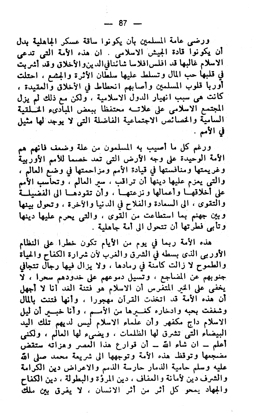 ورضى عامة المسلمين بأن يكونوا ساقة عسكر الجاهلية بدل أن يكونوا قادة الجيش الإسلامي. ان هذه الأمة التي تدعى الاسلام غالبها قد افلس افلاسا شائنا في الدين والأخلاق وقد أشربت في قلبها حب المال وتسلط عليها سلطان الاثرة والجشع، احتلت أوربا قلوب المسلمين وأصابهم انحطاط في الأخلاق والعقيدة، كانت هي سبب انهيار الدول الاسلامية، ولكن مع ذلك لم يزل المجتمع الإسلامي على علاته محتفظا ببعض المبادئ الخلقية السامية والخصائص الاجتماعية الفاضلة التي لا يوجد لها مثيل في الأمم.
