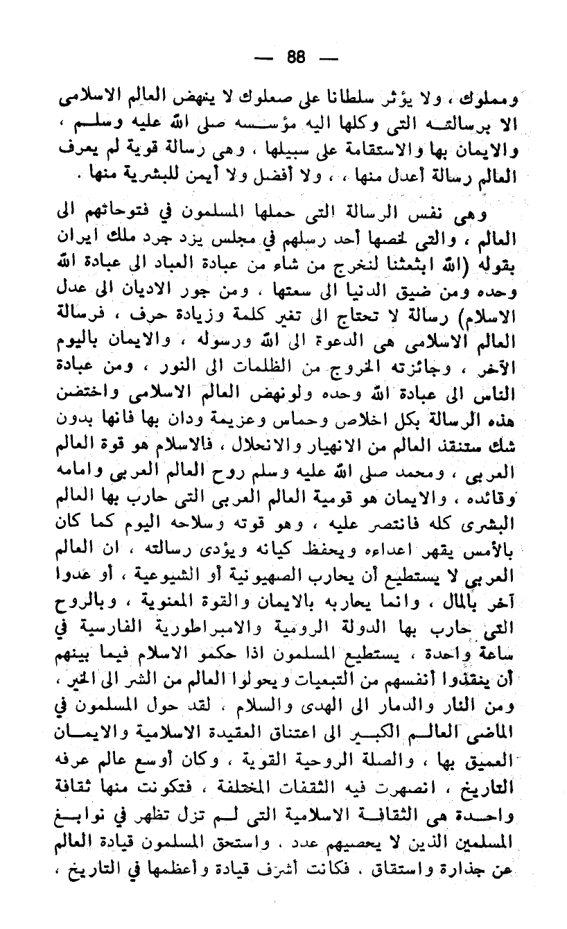 وهى نفس الرسالة التي حملها المسلمون في فتوحاتهم الى العالم، والتي لخصها أحد رسلهم في مجلس يزدجرد ملك إيران بقوله (الله ابتعثنا لنخرج من شاء من عبادة العباد الى عبادة الله وحده ومن ضيق الدنيا الى سعتها، ومن جور الاديان الى عدل الاسلام) رسالة لا تحتاج الى تغير كلمة وزيادة حرف، فرسالة العالم الإسلامي هي الدعوة الى الله ورسوله، والايمان باليوم الآخر، وجائزته الخروج من الظلمات إلى النور، ومن عبادة الناس الى عبادة الله وحده ولو نهض العالم الإسلامي واختضن هذه الرسالة بكل اخلاص وحماس وعزيمة ودان بها فإنها بدون شك ستنقذ العالم من الانهيار والانحلال، فالإسلام هو قوة العالم العربي، ومحمد صلى الله عليه وسلم روح العالم العربي وإمامه وقائده، والايمان هو قومية العالم العربي التي حارب بها العالم البشرى كله فانتصر عليه، وهو قوته وسلاحه اليوم كما كان بالأمس يقهر اعداءه ويحفظ كيانه ويؤدى رسالته، ان العالم العربي لا يستطيع أن يحارب الصهيونية أو الشيوعية، أو عدوا آخر بالمال. وانما يحاربه بالإيمان والقوة المعنوية، وبالروح التي حارب بها الدولة الرومية والامبراطورية الفارسية في ساعة واحدة، يستطيع المسلمون اذا حكموا الاسلام فيما بينهم أن ينقذوا أنفسهم من التبعيات ويحولوا العالم من الشر الى الخير، ومن النار والدمار الى الهدى والسلام. لقد حول المسلمون في الماضي العالم الكبير الى اعتناف العقيدة الاسلامية والايمان العميق بها، والصلة الروحية القوية، وكان أوسع عالم عرفه التاريخ، انصهرت فيه الثقافات المختلفة، فتكونت منها ثقافة واحدة هي الثقافة الاسلامية التي لم تزل تظهر في نوابغ المسلمين الذين لا يحصيهم عدد، واستحق المسلمون قيادة العالم عن جدارة واستحقاق. فكانت أشرف قيادة وأعظمها في التاريخ،