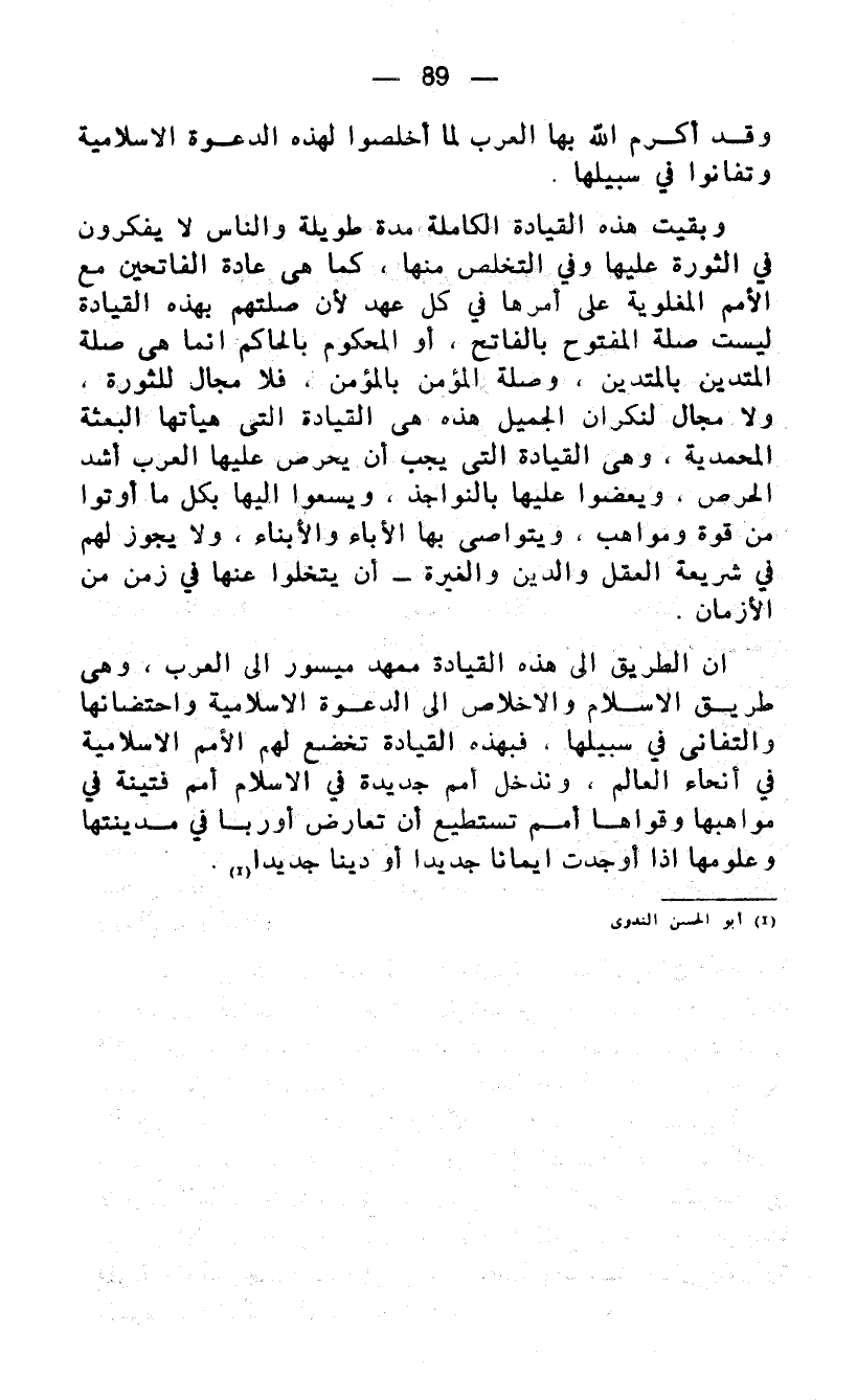 وبقيت هذه القيادة الكاملة مدة طويلة والناس لا يفكرون في الثورة عليها وفي التخلص منها، كما هي عادة الفاتحين مع الامم المغلوبة على أمرها في كل عهد لأن صلتهم بهذه القيادة ليست صلة المفتوح بالفاتح، أو المحكوم بالحاكم إنما هي صلة المتدين بالمتدين، وصلة المؤمن بالمؤمن، فلا مجال للثورة، ولا مجال لنكران الجميل هذه هي القيادة التي هيأتها البعثة المحمدية، وهى القيادة التي يجب أن يحرص عليها العرب أشد الحرص. ويعضوا عليها بالنواجذ، ويسعوا اليها بكل ما أوتوا من قوة ومواهب. ويتواصى بها الأباء والأبناء، ولا يجوز لهم في شريعة العقل والدين والغيرة - ان يتخلوا عنها في زمن من الأزمان.