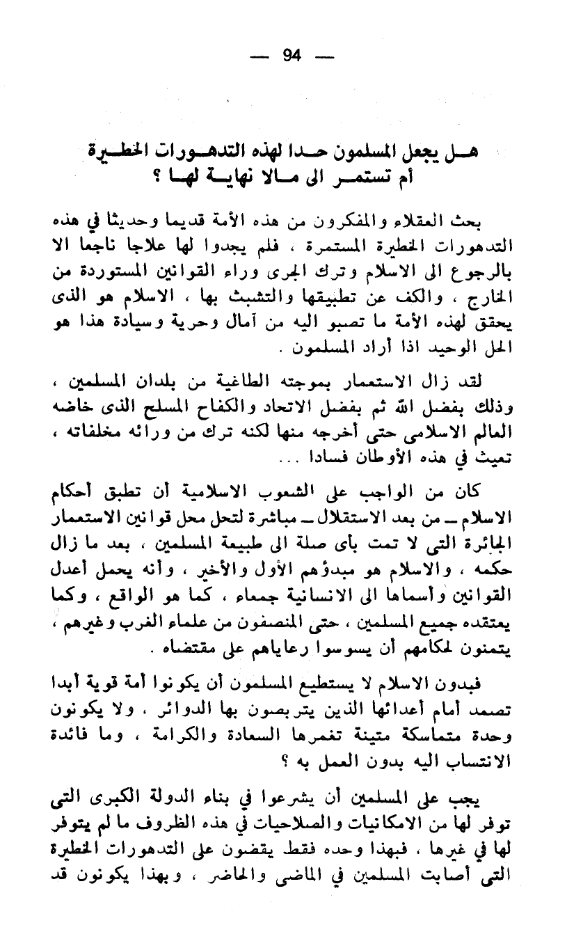 كان من الواجب على الشعوب الاسلامية أن تطبق أحكام الاسلام - من بعد الاستقلال - مباشرة لتحل محل قوانين الاستعمار الجائرة التي لا تمت بأي صلة الى طبيعة المسلمين. بعد ما زال حكمه، والاسلام هو مبدؤهم الأول والأخير، وأنه يحمل أعدل القوانين وأسماها الى الانسانية جمعاء. كما هو الواقع، وكما يعتقده جميع المسلمين، حتى المنصفون من علماء الغرب وغيرهم.